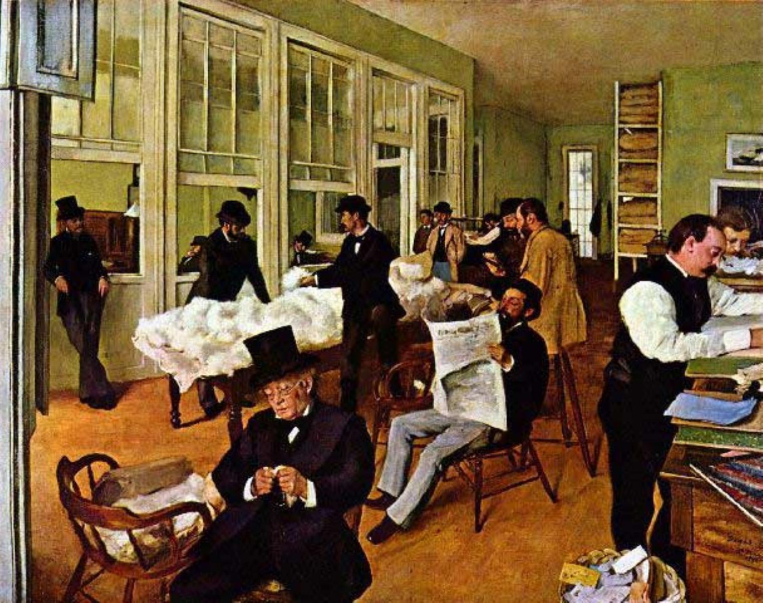 Artist: Degas - Title: The Cotton Exchange - Medium: Fine Art Reproduction Giclee on Archival Canvas - Image Size: Approximately 25.25 inches x 32 inches - Framed: Unframed on Unstretched Canvas - Edgar Degas was a French artist famous for his work in painting, sculpture, printmaking and drawing. He is regarded as one of the founders of Impressionism although he rejected the term, and preferred to be called a realist. A superb draftsman, he is especially identified with the subject of the dance, and over half of his works depict dancers. These display his mastery in the depiction of movement, as do his racecourse subjects and female nudes. His portraits are notable for their psychological complexity and depiction of human isolation. - Early in his career, he wanted to be a history painter, a calling for which he was well prepared by his rigorous academic training and close study of classic art. In his early thirties, he changed course, and by bringing the traditional methods of a history painter to bear on contemporary subject matter, he became a classical painter of modern life.