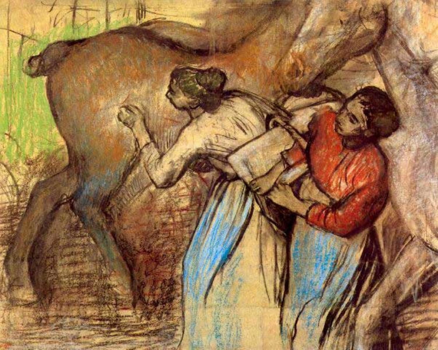 Artist: Degas - Title: Two Women Washing Horses - Medium: Fine Art Reproduction Giclee on Archival Canvas - Image Size: Approximately 25.5 inches x 32 inches - Framed: Unframed on Unstretched Canvas - Edgar Degas was a French artist famous for his work in painting, sculpture, printmaking and drawing. He is regarded as one of the founders of Impressionism although he rejected the term, and preferred to be called a realist. A superb draftsman, he is especially identified with the subject of the dance, and over half of his works depict dancers. These display his mastery in the depiction of movement, as do his racecourse subjects and female nudes. His portraits are notable for their psychological complexity and depiction of human isolation. - Early in his career, he wanted to be a history painter, a calling for which he was well prepared by his rigorous academic training and close study of classic art. In his early thirties, he changed course, and by bringing the traditional methods of a history painter to bear on contemporary subject matter, he became a classical painter of modern life.