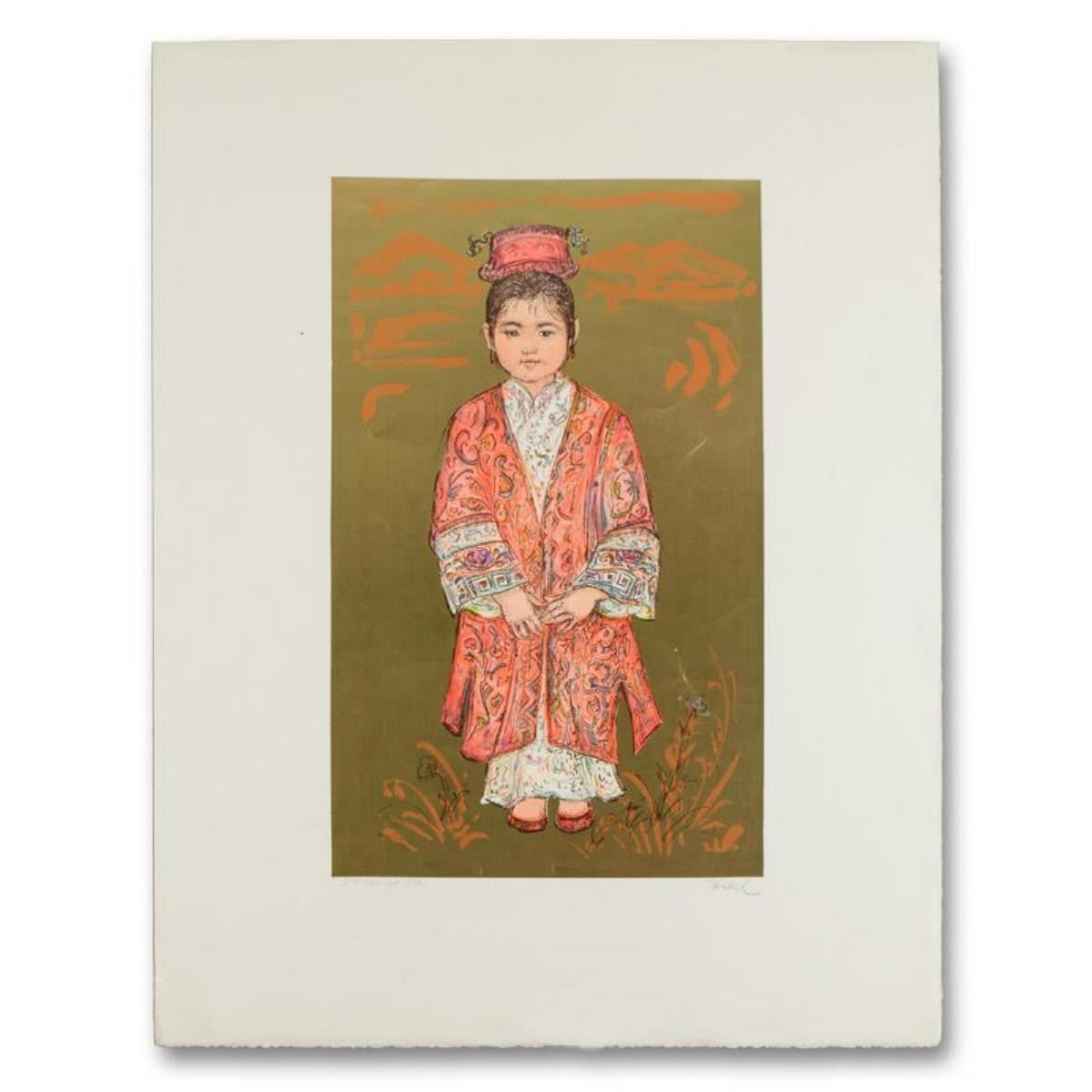 "Sun Ming Tsai of Beijing" is a limited edition lithograph on paper by Edna Hibel (1917-2014), numbered and Hand Signed by the artist. Includes Letter of Authenticity. Measures approx. 19.5" x 25.5" (with border), 11" x 18" (image). Please note: there is some creasing on the image. **