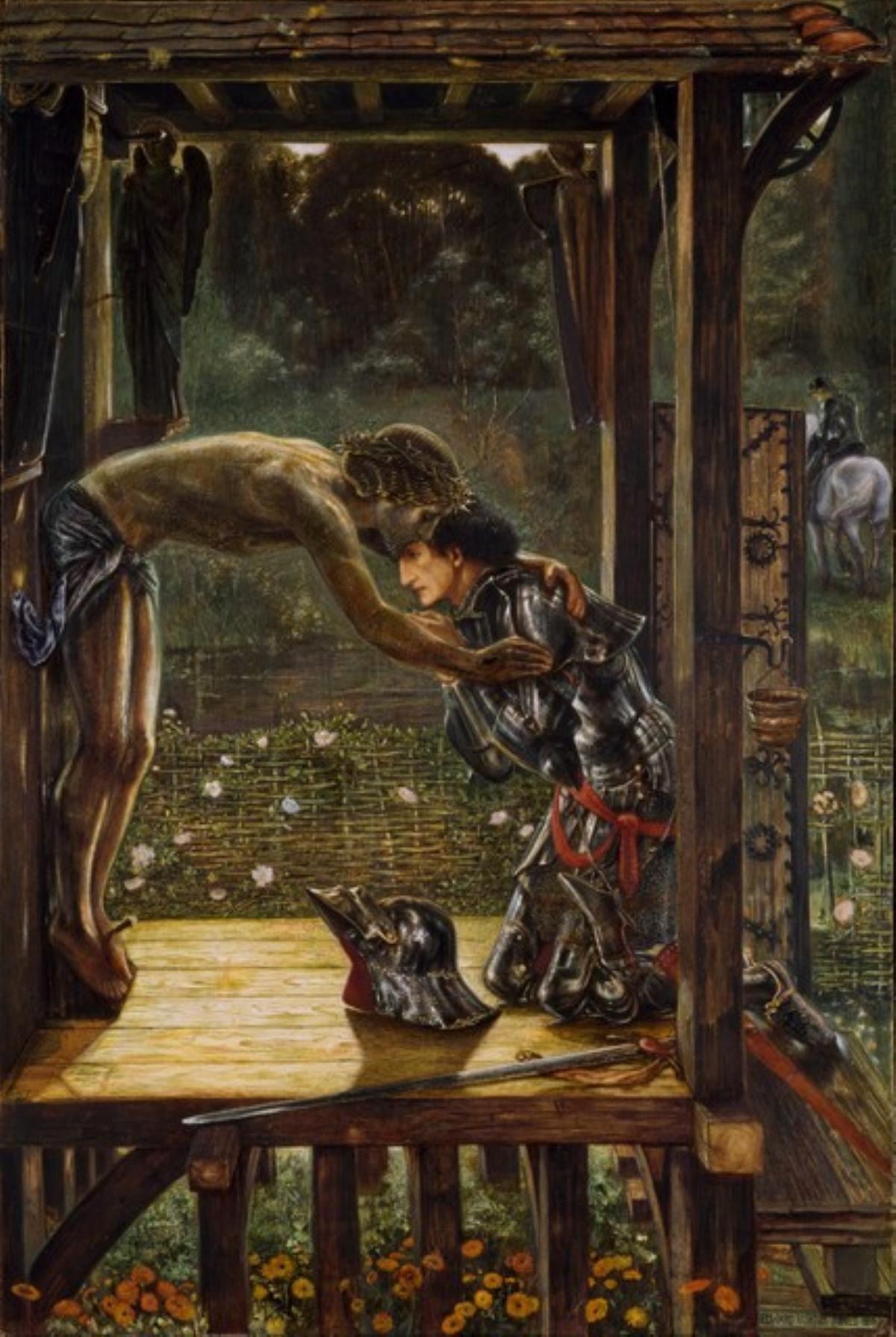 Artist: Edward Burne-Jones - Title: The Merciful Knight - Medium: Fine Art Reproduction Giclee on Canvas - Image Size: Approximately 32 inches x 21.5 inches - Unframed on Unstretched Canvas - Biography: Sir Edward Coley Burne-Jones, (28 August 1833 - 17 June 1898) was a British artist and designer associated with the phase of the Pre-Raphaelite movement, who worked with William Morris on decorative arts as a founding partner in Morris, Marshall, Faulkner & Co. - Burne-Jones was involved in the rejuvenation of the tradition of stained glass art in Britain; his works include windows in St. Philip's Cathedral, Birmingham, St Martin in the Bull Ring, Birmingham, Holy Trinity Church, Sloane Square, Chelsea, St Peter and St Paul parish church in Cromer, St Martin's Church in Brampton, Cumbria (the church designed by Philip Webb), St Michael's Church, Brighton, Trinity Church in Frome, All Saints, Jesus Lane, Cambridge, St Edmund Hall and Christ Church, two colleges of the University of Oxford. His stained glass works also feature in St Anne's Church, Brown Edge, Staffordshire Moorlands and St Edward the Confessor church at Cheddleton Staffordshire. Burne-Jones's early paintings show the inspiration of Dante Gabriel Rossetti, but by the 1860s Burne-Jones was discovering his own artistic "voice". - In 1877, he was persuaded to show eight oil paintings at the Grosvenor Gallery (a new rival to the Royal Academy). These included The Beguiling of Merlin. The timing was right and he was taken up as a herald and star of the new Aesthetic Movement. Burne-Jones worked in crafts; including designing ceramic tiles, jewellery, tapestries and mosaics.