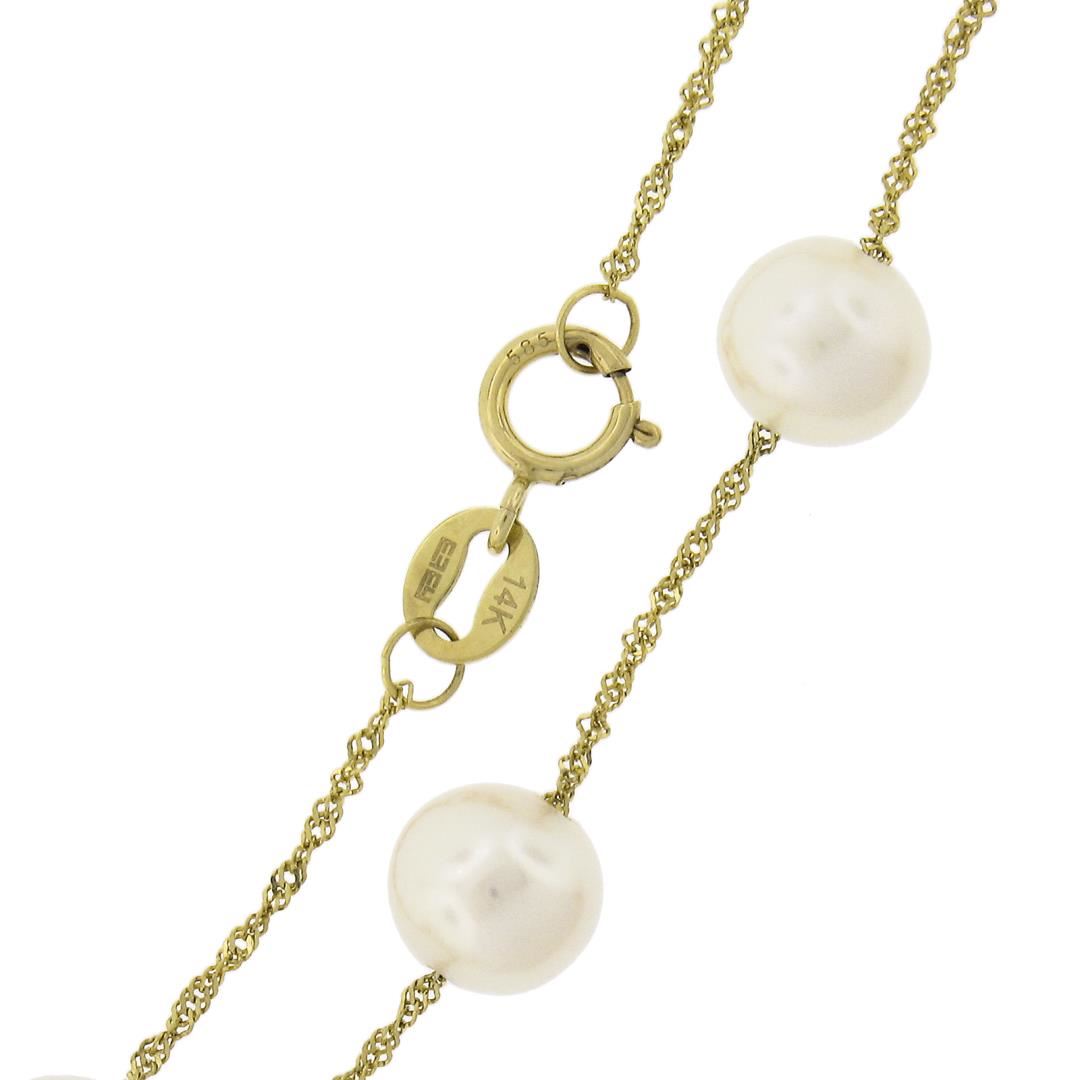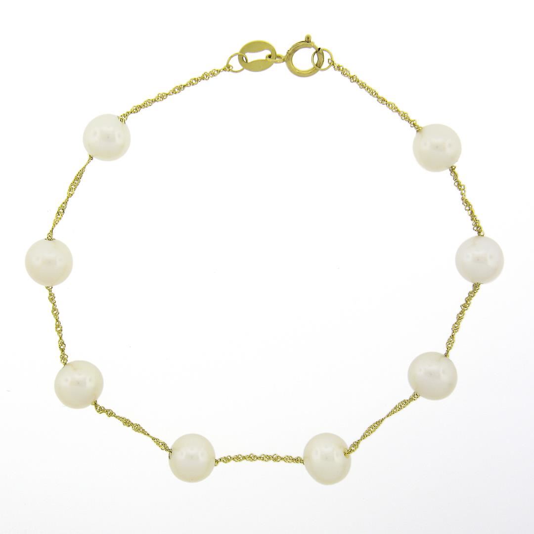 A solid 14k yellow gold station bracelet by Effy, with 8 round shape cultured pearls (6.2mm to 6.6mm ). It weighs a total of 3.09 grams, measures 6.6mm wide, and measures 7 inches in length.