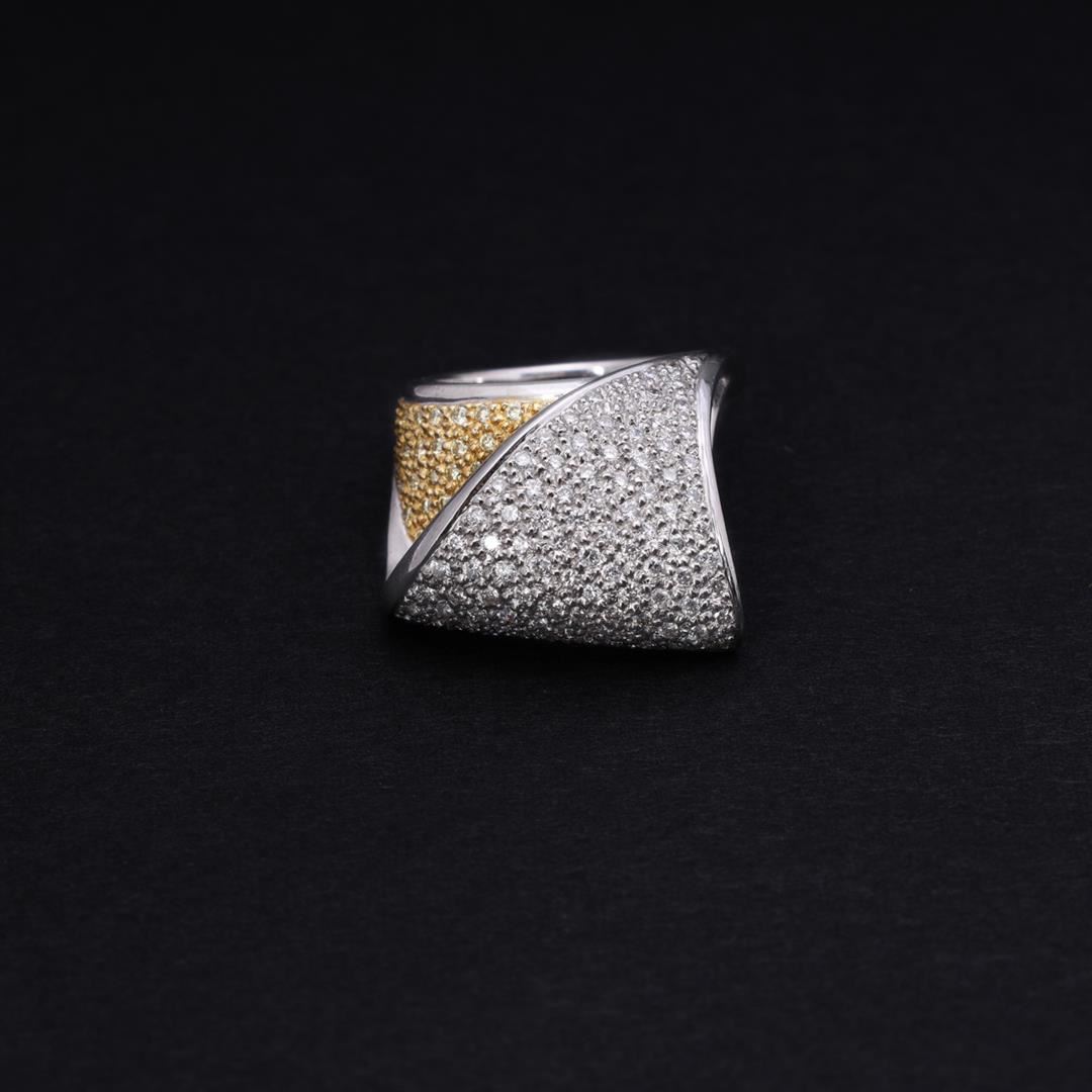 Elaborate 18k gold cluster ring; each overlapping fold set with numerous yellow and white diamods, the interior band marked k18 750 with stylized letter; gross weight 11.9 g, size 7