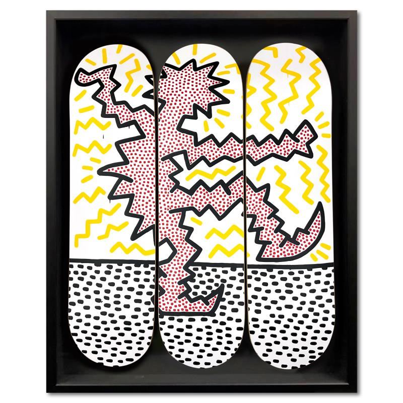 "Electric" is a skateboard triptych by Keith Haring (1958-1990), bearing the plate signature of the artist inverso. This triptych comes custom framed. Includes Letter of Authenticity. Measures approx. 37" x 30" (frame), 32" x 24" (skateboards).