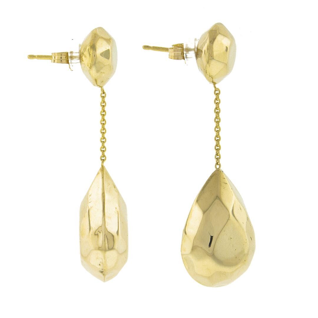 A solid 14k yellow gold dangle drop earrings. The earrings measure approximately 40.1x13.3mm and weigh a total of 4.24 grams.