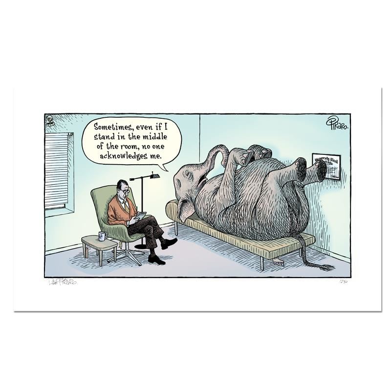 Elephant Room by Bizarro. "Elephant Room" is a limited edition giclee on paper by Dan Piraro, creator of the critically acclaimed and award winning comic strip, Bizarro! This piece is numbered and hand signed by the artist and includes a letterof authenticity. Measures approximtely 8" x 15" (image).