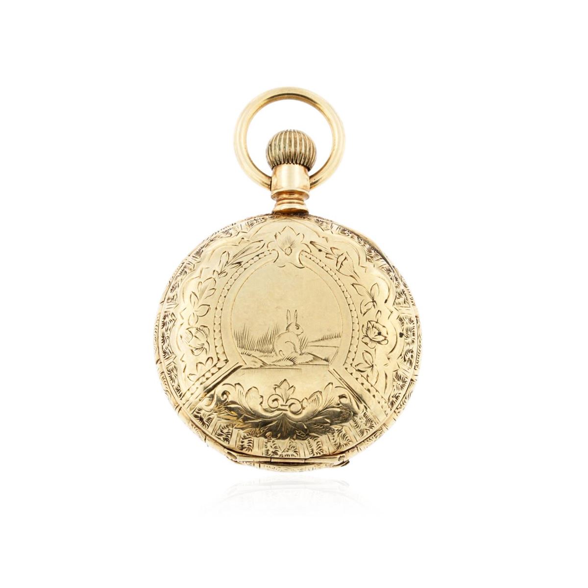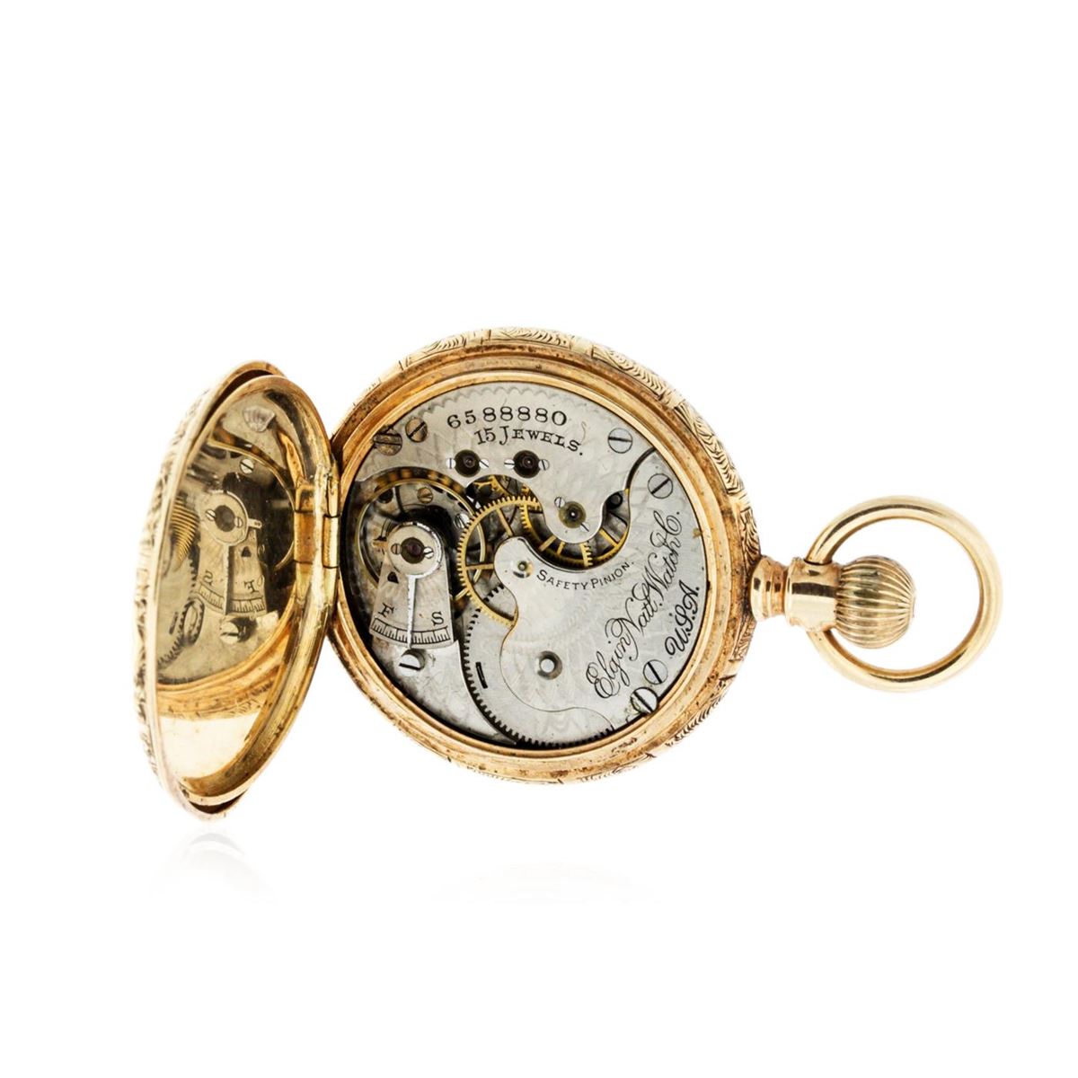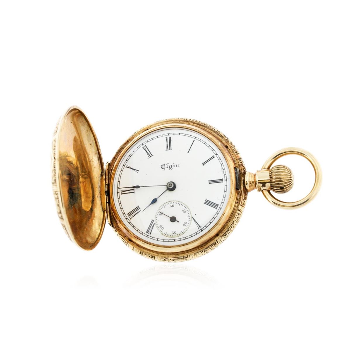One, antique Elgin full hunter case, pocket watch electronically tested 14KT yellow gold-filled, Case: 35mm, Dial Case Cover: ornate floral pattern with a raised central section available for engraving, Inner Movement Case Cover: polished, Outer Movement Case Cover: stamped "Warranted 14K U.S. Assay", on the inside, the obverse side is completed with a raised floral scene, framing a lone Rabbit in a meadow, Bezel: polished, Crystal: acrylic. Circa: 1897 Movement: Elgin USA fifteen jewel mechanical stem wind, Signed Dial: White, pointed hands and Roman numerals, Subsidiary Second's Sub Dial: at the 6 o'clock position, Condition: G-4 Average. Total Weight of Watch 36.59 grams. AIG Appraised at $2,150.00.