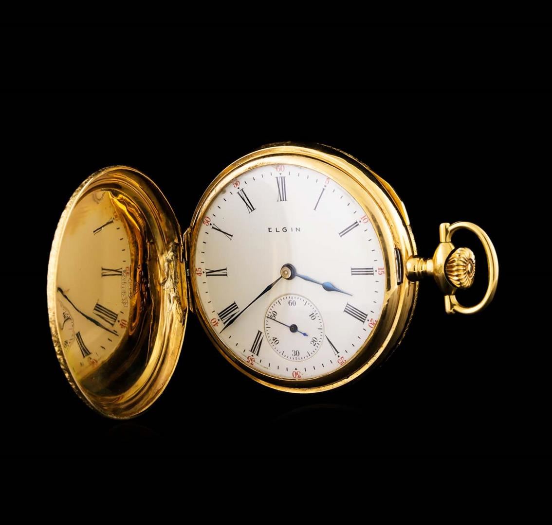 One, antique Elgin full hunter case, pocket watch electronically tested 14KT yellow gold, Case: 48mm, Dial Case Cover: ornate pattern with a raised central section available for re-engraving, Inner Movement Case Cover: polished, Outer Movement Case Cover: the obverse side is completed with a raised pattern, Bezel: polished, Crystal: acrylic. Circa: 1910 Movement: Elgin USA mechanical stem wind, Elgin Signed Dial: White, Blued steel pointed hands, Roman numerals, minute indices and Red five minute markers, Subsidiary Second's Sub Dial: at the 6 o'clock position, Condition: G-4 Average. Total Weight of Watch 84.86 grams. AIG Appraised at $4,990.00.