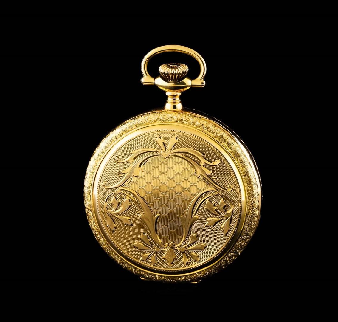 One, antique Elgin full hunter case, pocket watch electronically tested 14KT yellow gold, Case: 48mm, Dial Case Cover: ornate pattern with a raised central section available for re-engraving, Inner Movement Case Cover: polished, Outer Movement Case Cover: the obverse side is completed with a raised pattern, Bezel: polished, Crystal: acrylic. Circa: 1910 Movement: Elgin USA mechanical stem wind, Elgin Signed Dial: White, Blued steel pointed hands, Roman numerals, minute indices and Red five minute markers, Subsidiary Second's Sub Dial: at the 6 o'clock position, Condition: G-4 Average. Total Weight of Watch 84.86 grams. AIG Appraised at $4,990.00.