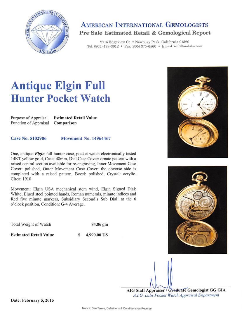 One, antique Elgin full hunter case, pocket watch electronically tested 14KT yellow gold, Case: 48mm, Dial Case Cover: ornate pattern with a raised central section available for re-engraving, Inner Movement Case Cover: polished, Outer Movement Case Cover: the obverse side is completed with a raised pattern, Bezel: polished, Crystal: acrylic. Circa: 1910 Movement: Elgin USA mechanical stem wind, Elgin Signed Dial: White, Blued steel pointed hands, Roman numerals, minute indices and Red five minute markers, Subsidiary Second's Sub Dial: at the 6 o'clock position, Condition: G-4 Average. Total Weight of Watch 84.86 grams. AIG Appraised at $4,990.00.