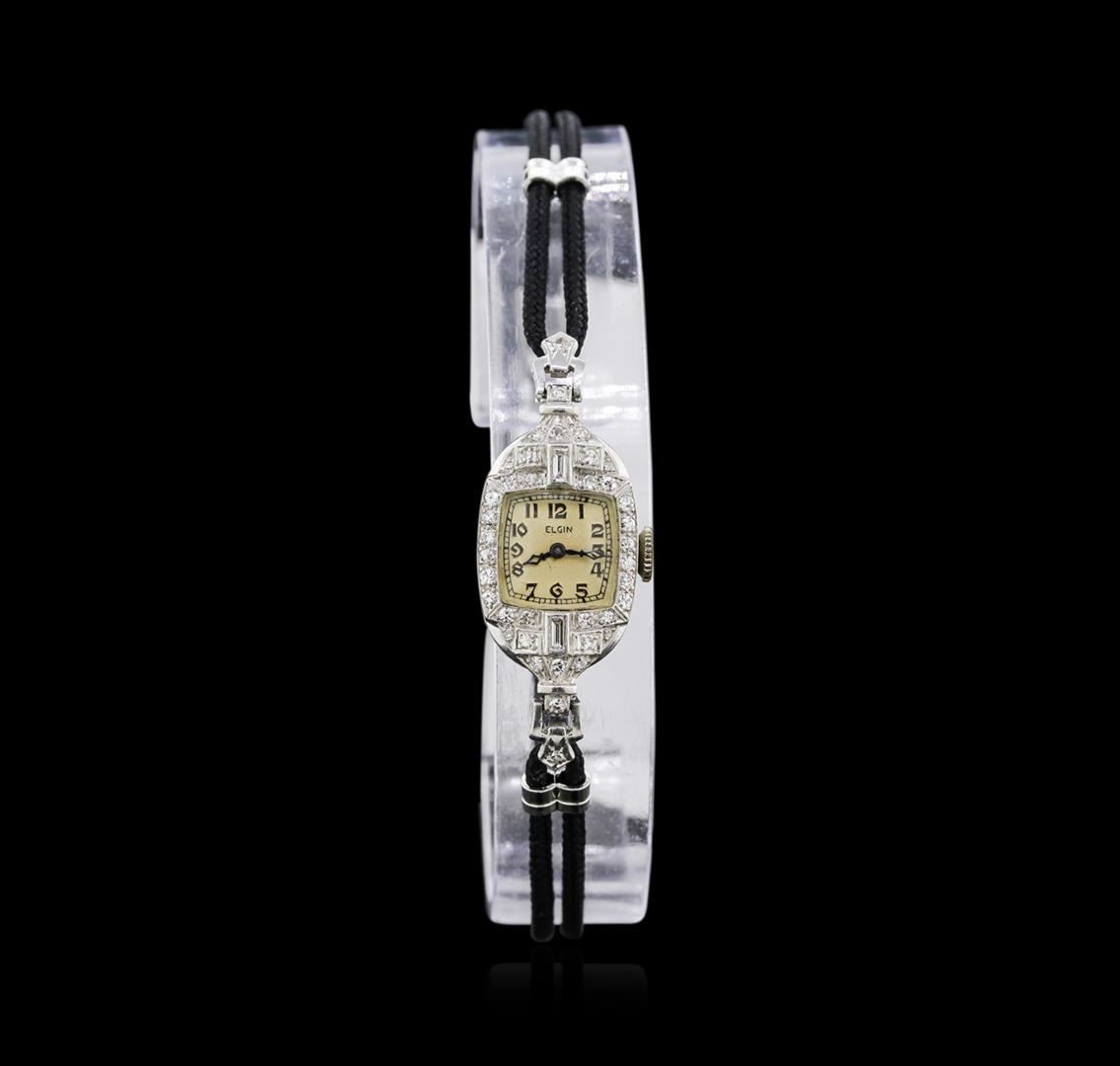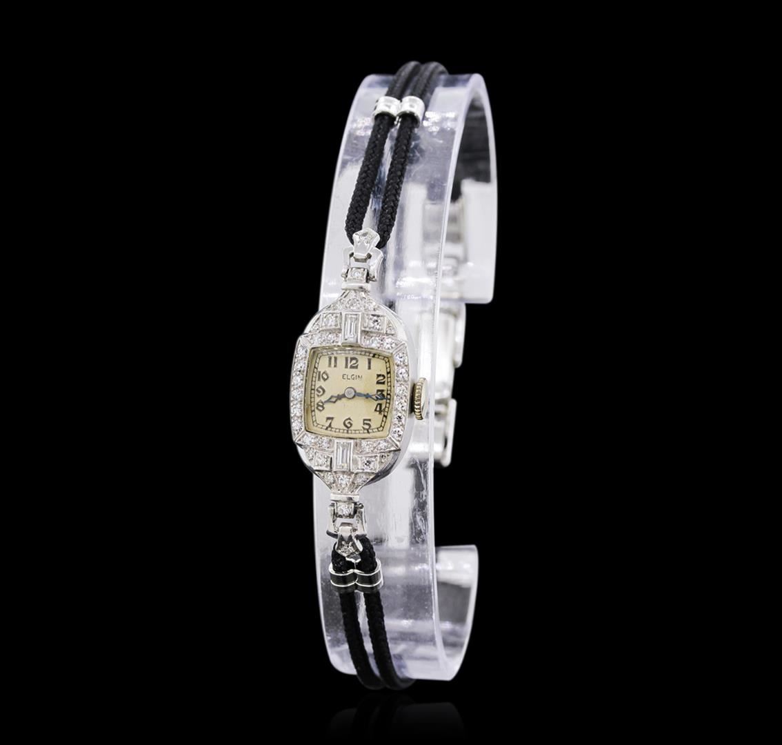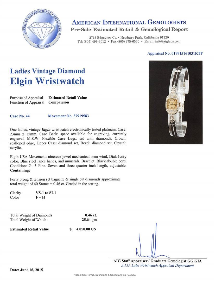 One ladies, vintage Elgin wristwatch electronically tested platinum, Case: 23mm x 15mm, Case Back: space available for engraving, currently engraved M.S.W. Flexible Case Lugs: set with diamonds, Crown: scalloped edge, Upper Case: diamond set, Bezel: diamond set, Crystal: acrylic. Elgin USA Movement: nineteen jewel mechanical stem wind, Dial: Ivory color, Blue steel lance hands, and numerals, Bracelet: Black double cord, Condition: G-5 Fine. Seven and three quarter inch length, adjustable. Containing: Forty prong & tension set baguette & single cut diamonds approximate total weight of 40 Stones = 0.46 ct. Graded in the setting. Clarity: VS-1 to SI-1. Color: F - H. Total Weight of Diamonds: 0.46ct. Total Weight of Watch: 25.64 grams. AIG Appraised at $4,050.00.