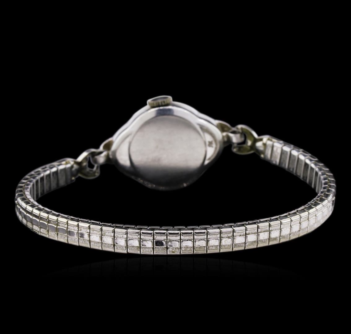 17.2 grams total weight; 34 single cut diamonds .01 pt each (.34 pts total); Case measures 18 x 26 mm; Back of case stamped: 900 Platinum-100 Iridium; Inside of case stamped: CASED AND TIMED BY ELGIN NATIONAL WATCH CO. 900 PLAT 100 IRID KO E 116668; Movement stamped: 17 Jewels Elgin, U.S.A. 36101496 FS; Speidel stretchable stainless steel band.