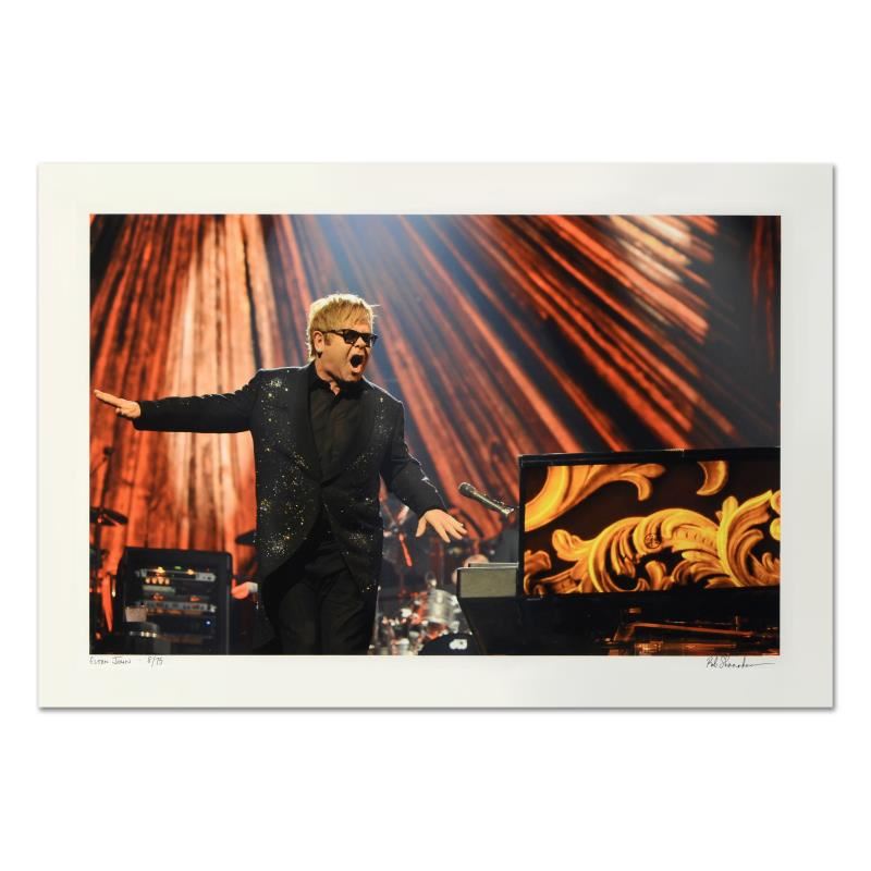 "Elton John" is a framed limited edition giclee on paper, numbered and hand signed by acclaimed music industry photographer Rob Shanahan. Includes Certificate of Authenticity. Measures approximately 22" x 14.5" (image).