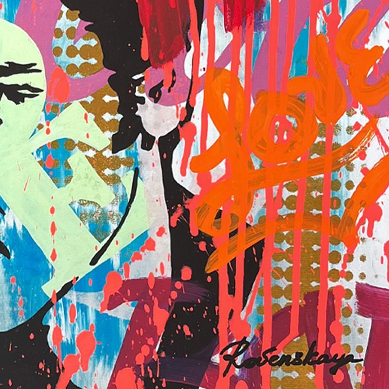 "Elvis" is a one-of-a-kind mixed media on deckle edge paper by Nastya Rovenskaya; hand signed by the artist. This piece comes custom framed and includes letter of authenticity. Measures approximately 26" x 30" (framed), 20" x 24" (image).