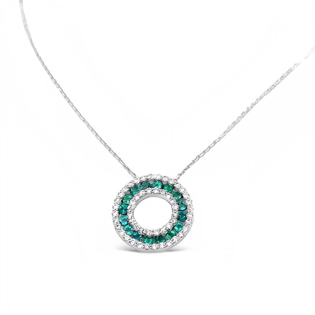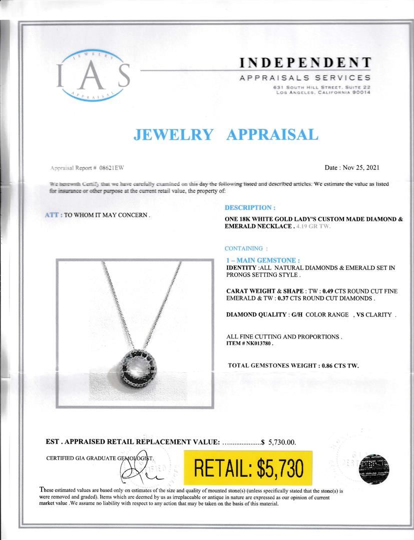 Emerald and Diamond Pendant. Please see Photos and Description for all available information. This unique and contemporary design features a .49ct emerald cut diamond set on a white gold chain. The stone is surrounded by sparkling round diamonds that complement the emerald perfectly. This pendant is the perfect gift for any occasion.
