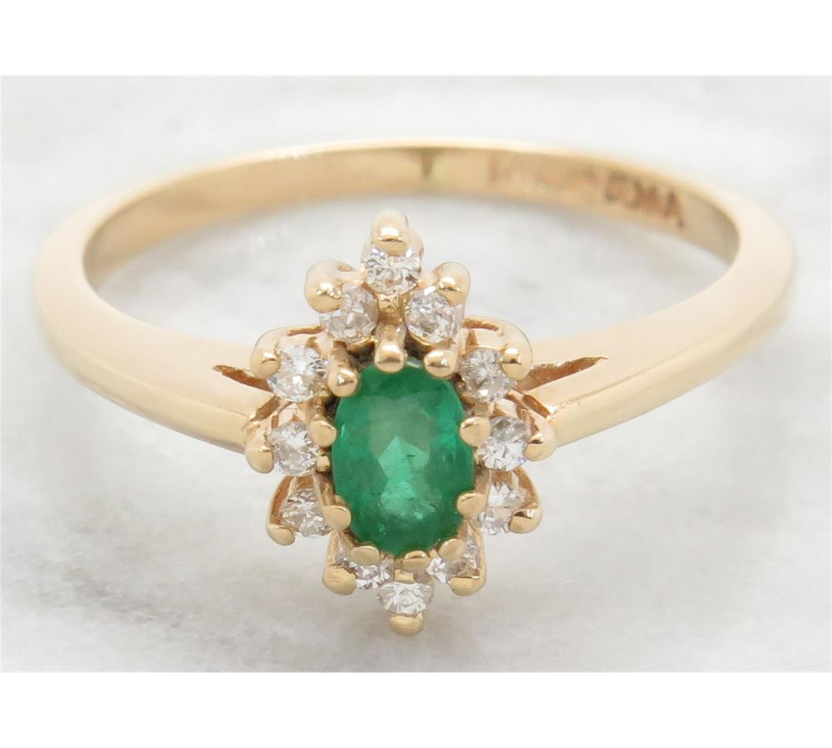 One tested 14K yellow gold emerald and diamond ring. Containing: One 4.6MM X 3.2MM Emerald. 12 Round Brilliant Cut Diamonds. Weight: 2.5 grams, Size: 5.0.