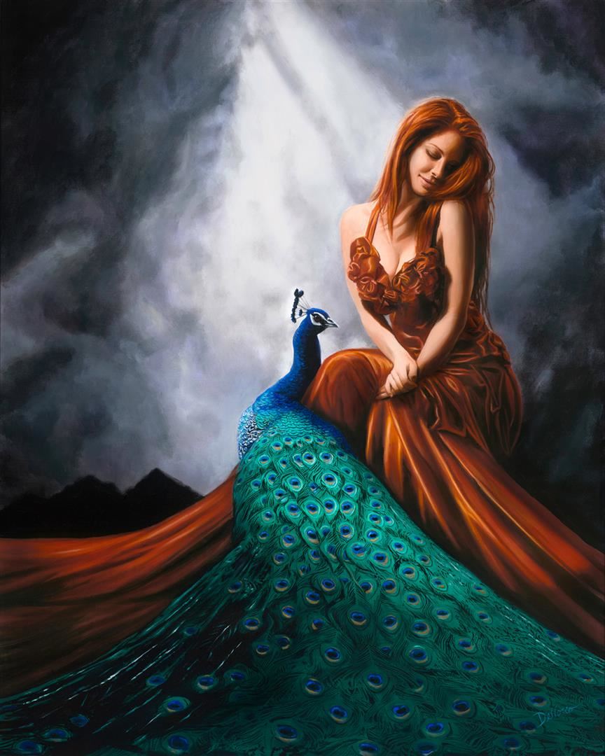 A redhead and a blue Peacock. Two of a kind or a match made of Fairy Tales? This is a gorgeous 40"x30 giclee on canvas, S/n by DELLORCO, with COA.