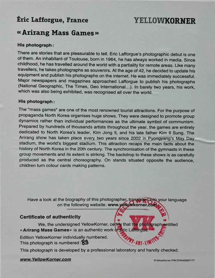 Eric Lafforgue France Arirang Mass Game YellowKorner Certified Photograph. Certificate of Authenticity from YellowKorner affixed to the back. Matted Dimensions 16"x20". Protected with Clear Mylar Sleeve.