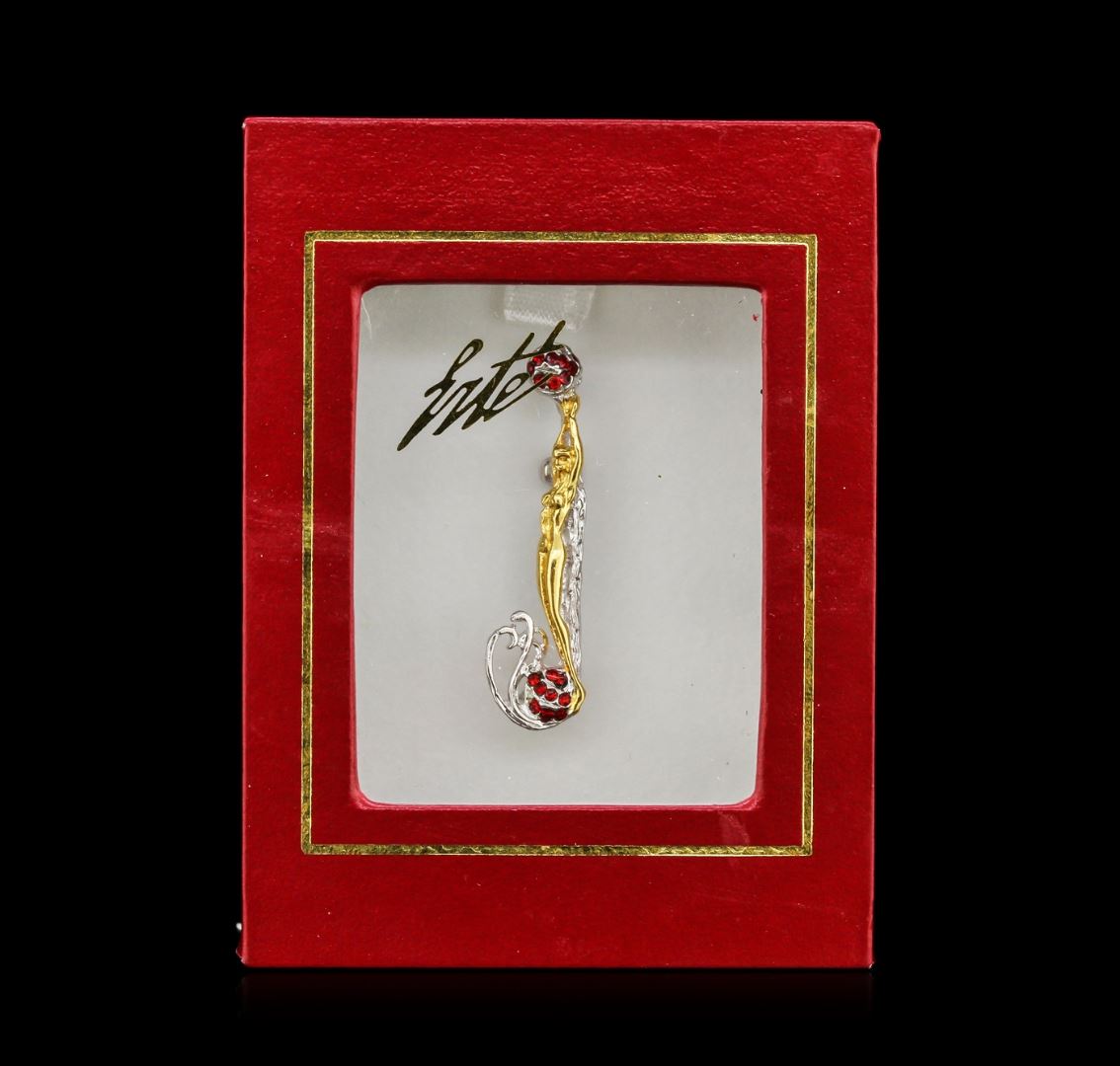 Erte's famous "Alphabet" series was first a Suite of serigraphs and then a priceless collection of figures cast in precious metals set with gemstones. We are pleased to present this sparking Pendant/Brooch depicting the letter "J", made of solid gold-plated Sterling Silver. The item weighs approximately 3 grams.
