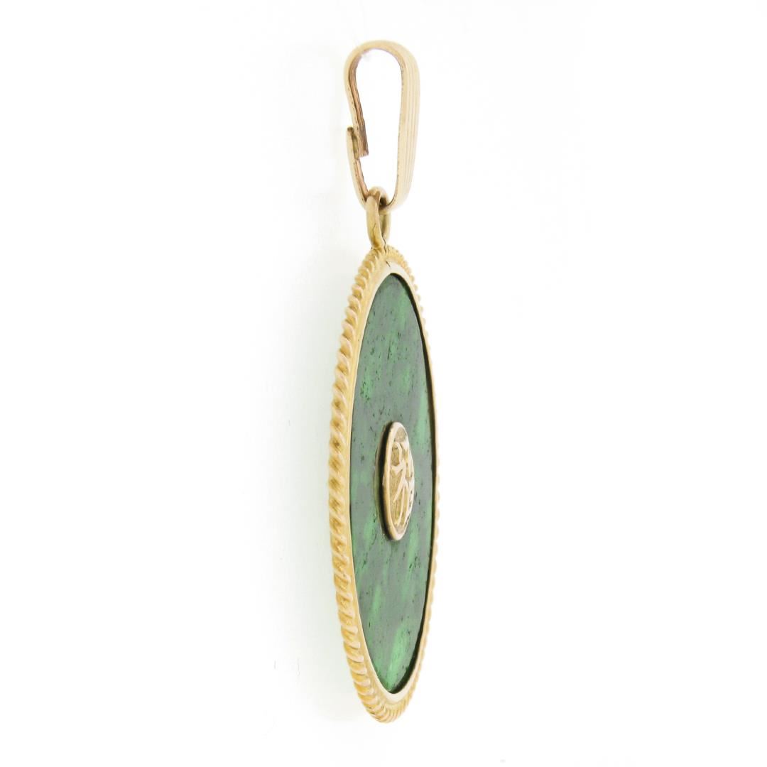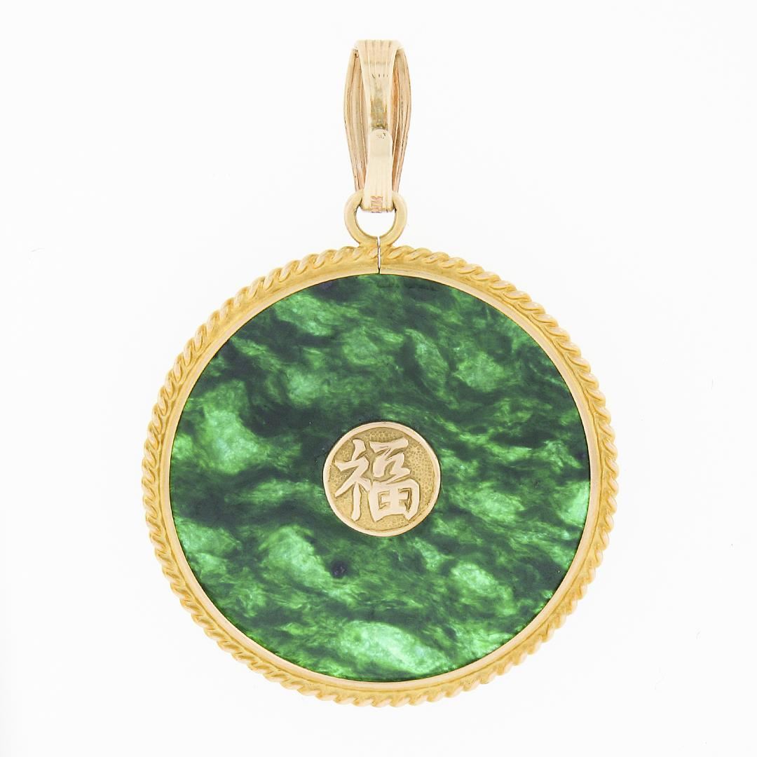 A solid 10k yellow gold disk pendant, with 1 round cut natural jade (26.8mm). The pendant weighs a total of 4.40 grams, measures 43.1x30.7mm including the bail, and the inside of the bail measures 8.3x3.1mm.