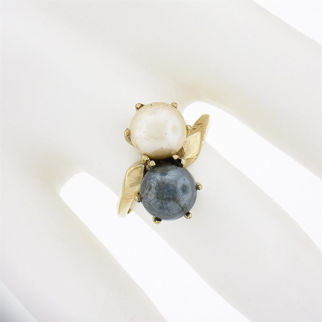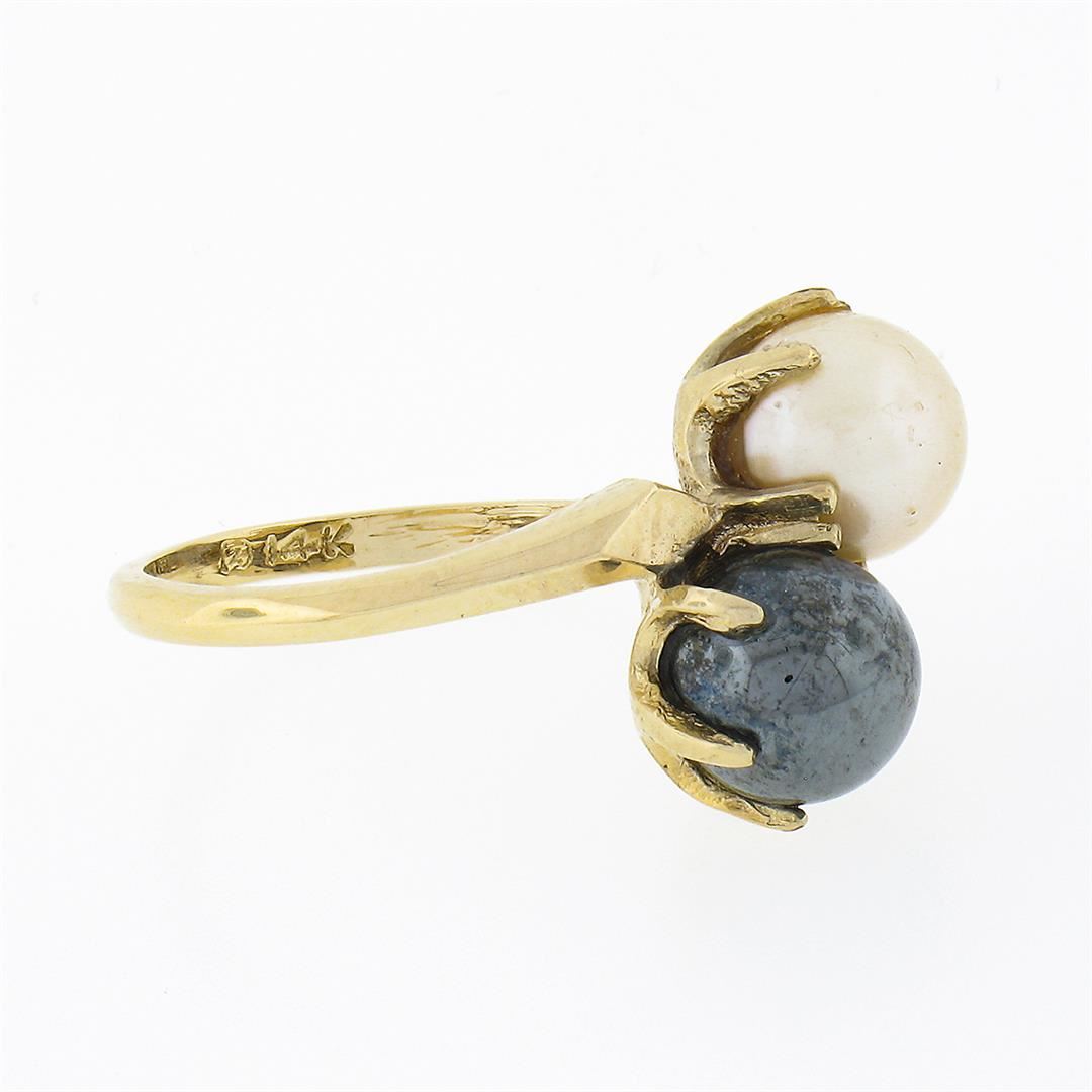 An estate solid 14k yellow gold bypass ring, with 2 round shape natural cultured pearls (7.3mm each). The ring is size 5.5, weighs a total of 4.38 grams, and measures 15.30mm wide.