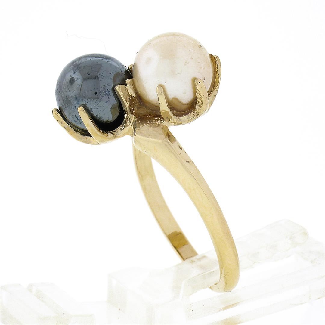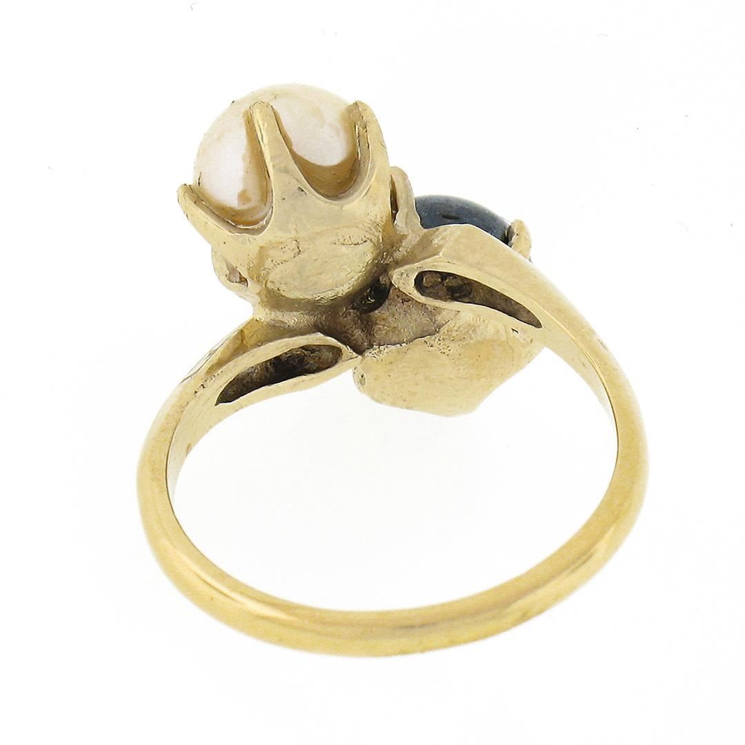 An estate solid 14k yellow gold bypass ring, with 2 round shape natural cultured pearls (7.3mm each). The ring is size 5.5, weighs a total of 4.38 grams, and measures 15.30mm wide.