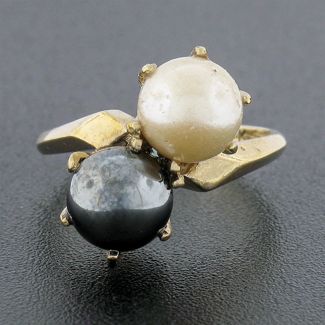 An estate solid 14k yellow gold bypass ring, with 2 round shape natural cultured pearls (7.3mm each). The ring is size 5.5, weighs a total of 4.38 grams, and measures 15.30mm wide.