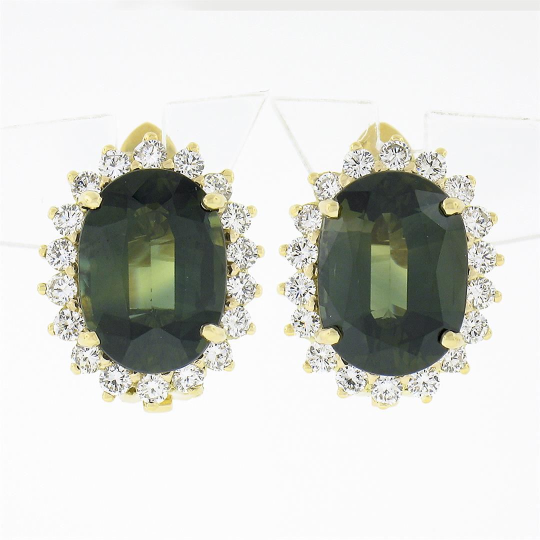 A pair of solid 14k yellow gold earrings, with 2 Gia certified oval cut natural green sapphires (7.37ctw), surrounded with a halo of 36 round brilliant cut natural diamonds (G/H - VS1/VS2 ; 0.81ctw). The earrings measure approximately 15.20x12.30mm and weigh a total of 6.70 grams.