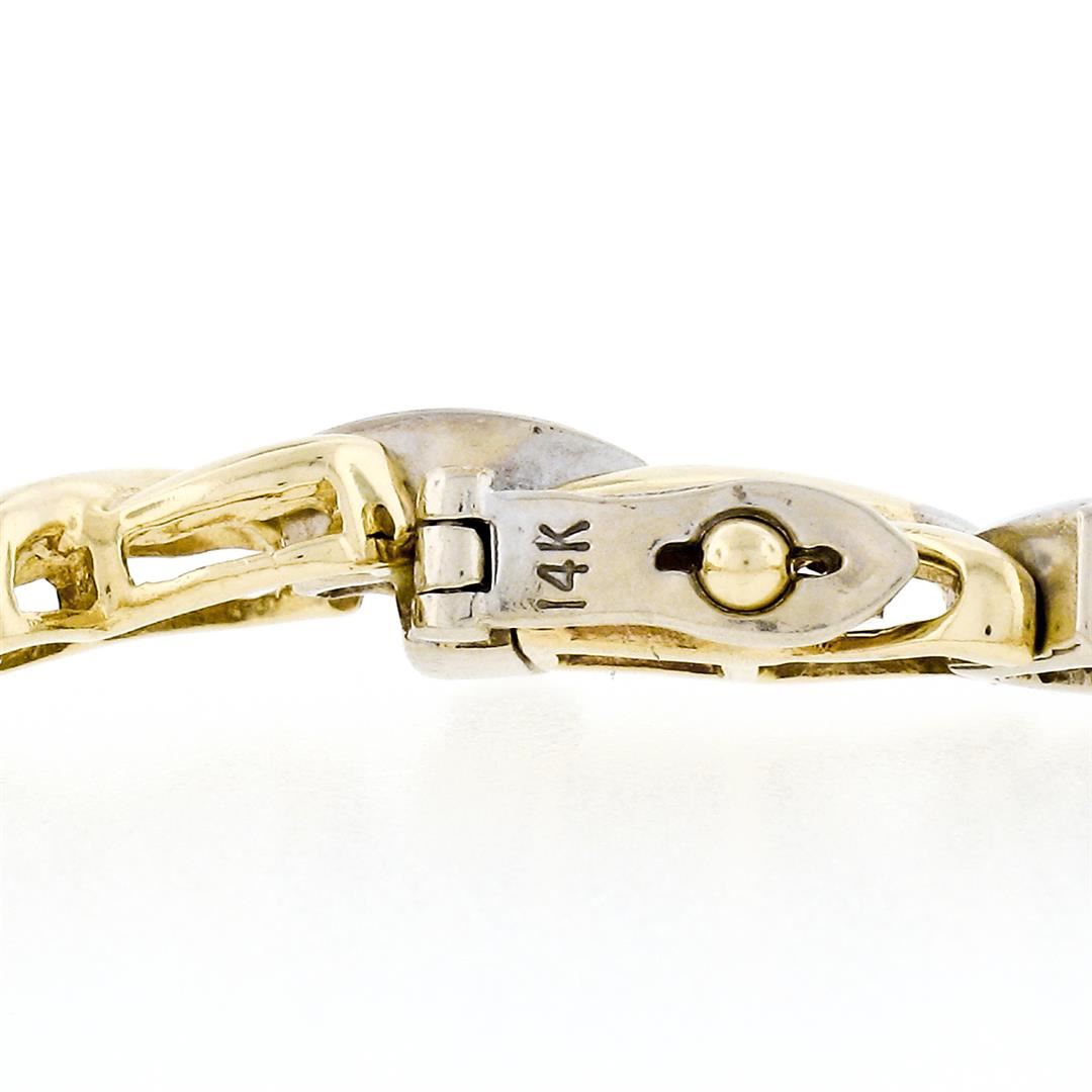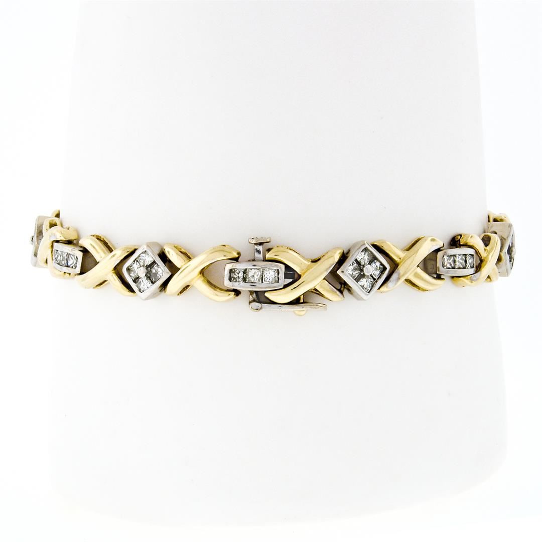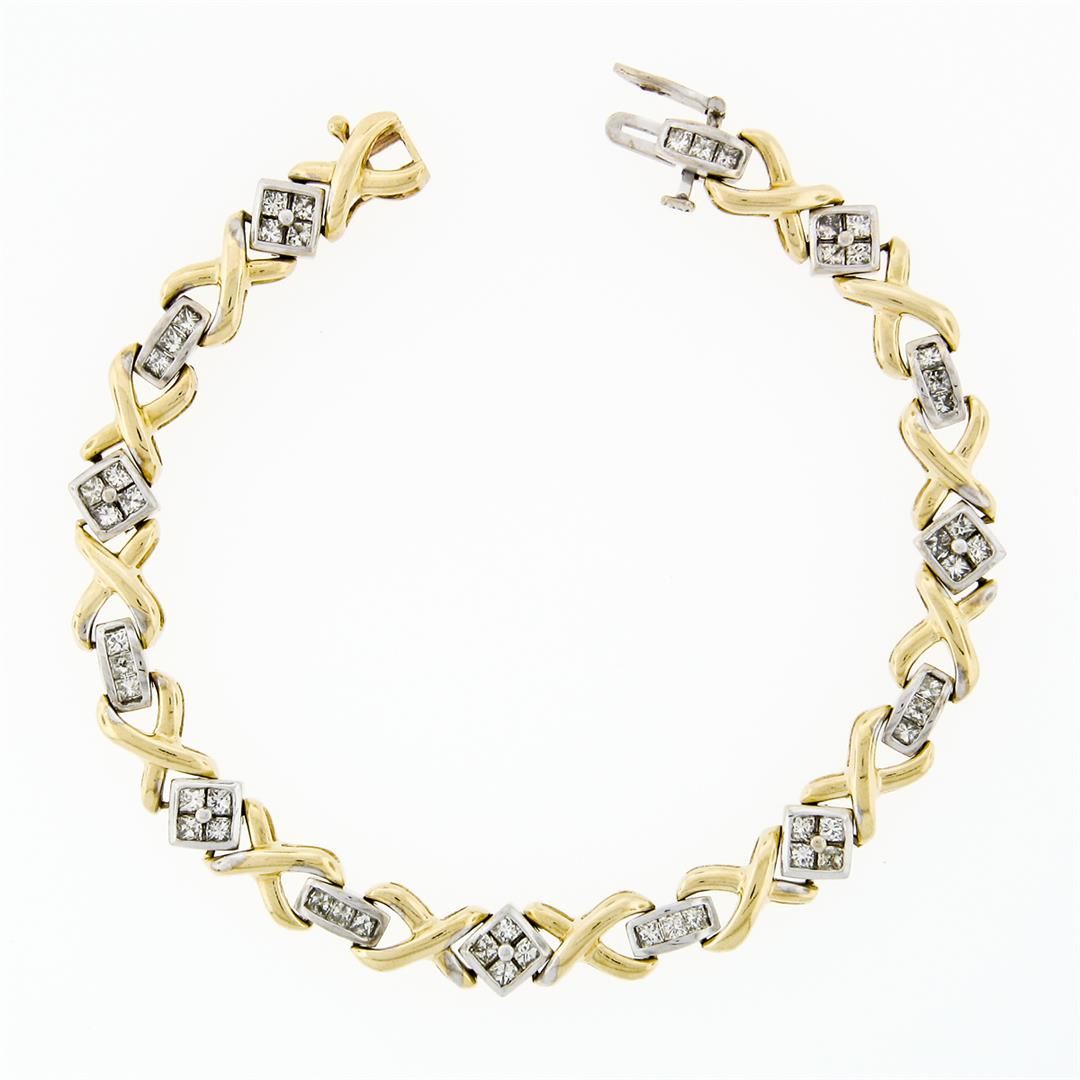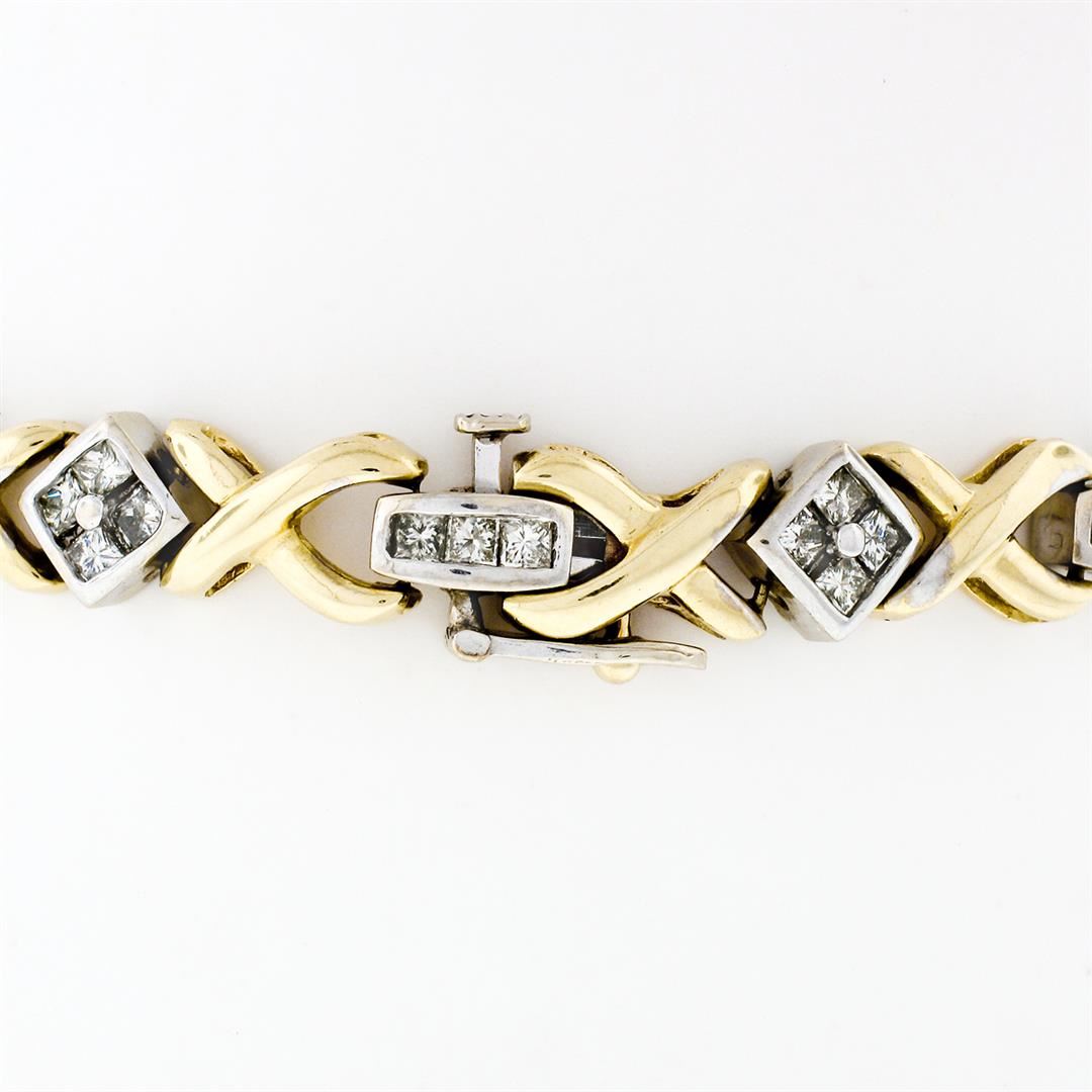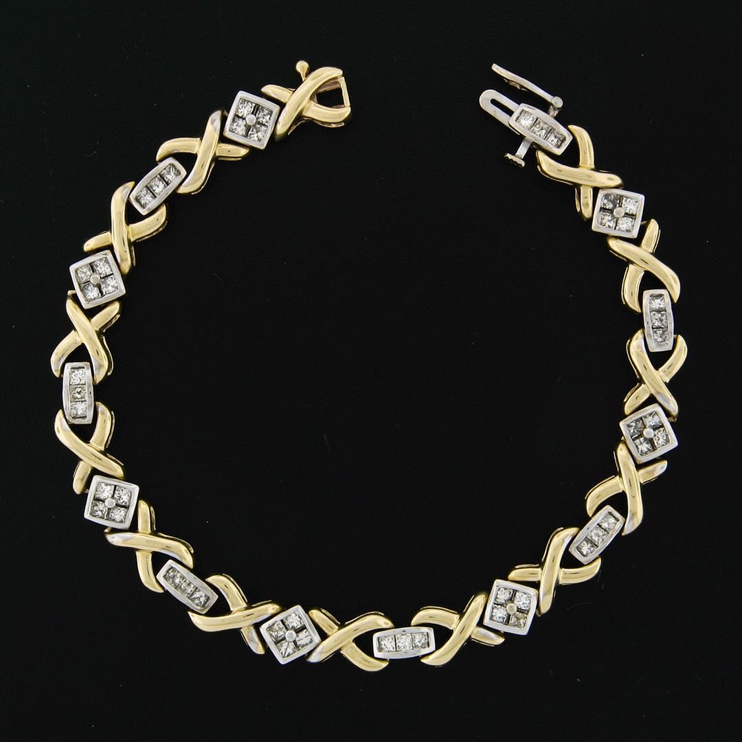 An estate solid 14k yellow & white gold tennis x link bracelet, with 49 princess cut natural diamonds (H/I - VS1/VS2; 3.0ctw). It weighs a total of 15.94 grams, measures 7.20mm wide, and measures 15.94 inches in length.