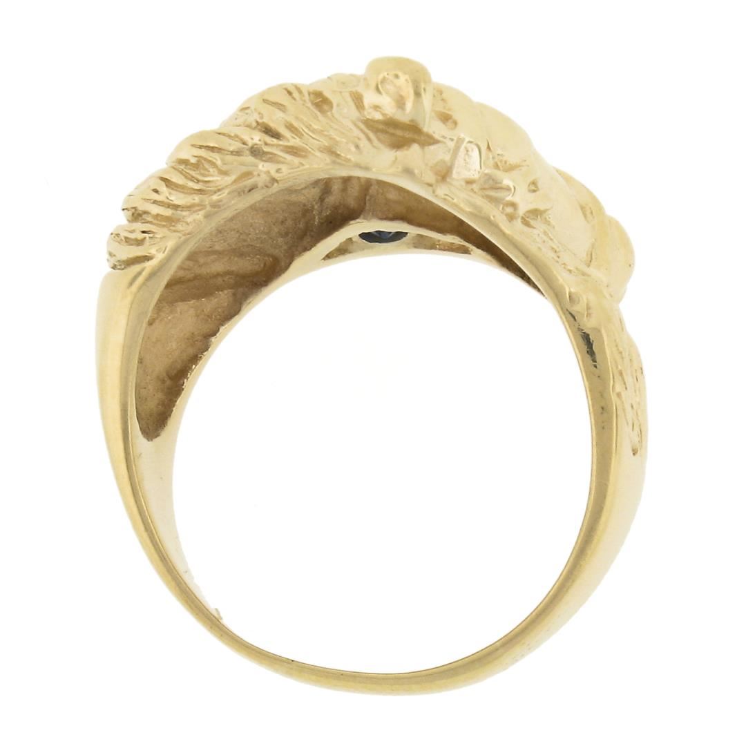 A solid 14k yellow gold horse ring, with 1 round cut natural diamond (G - SI2 ; 0.03ct), and 1 round cut natural sapphire (0.07ct). The ring is size 7.0, weighs a total of 7.71 grams, and measures 15.6mm wide.