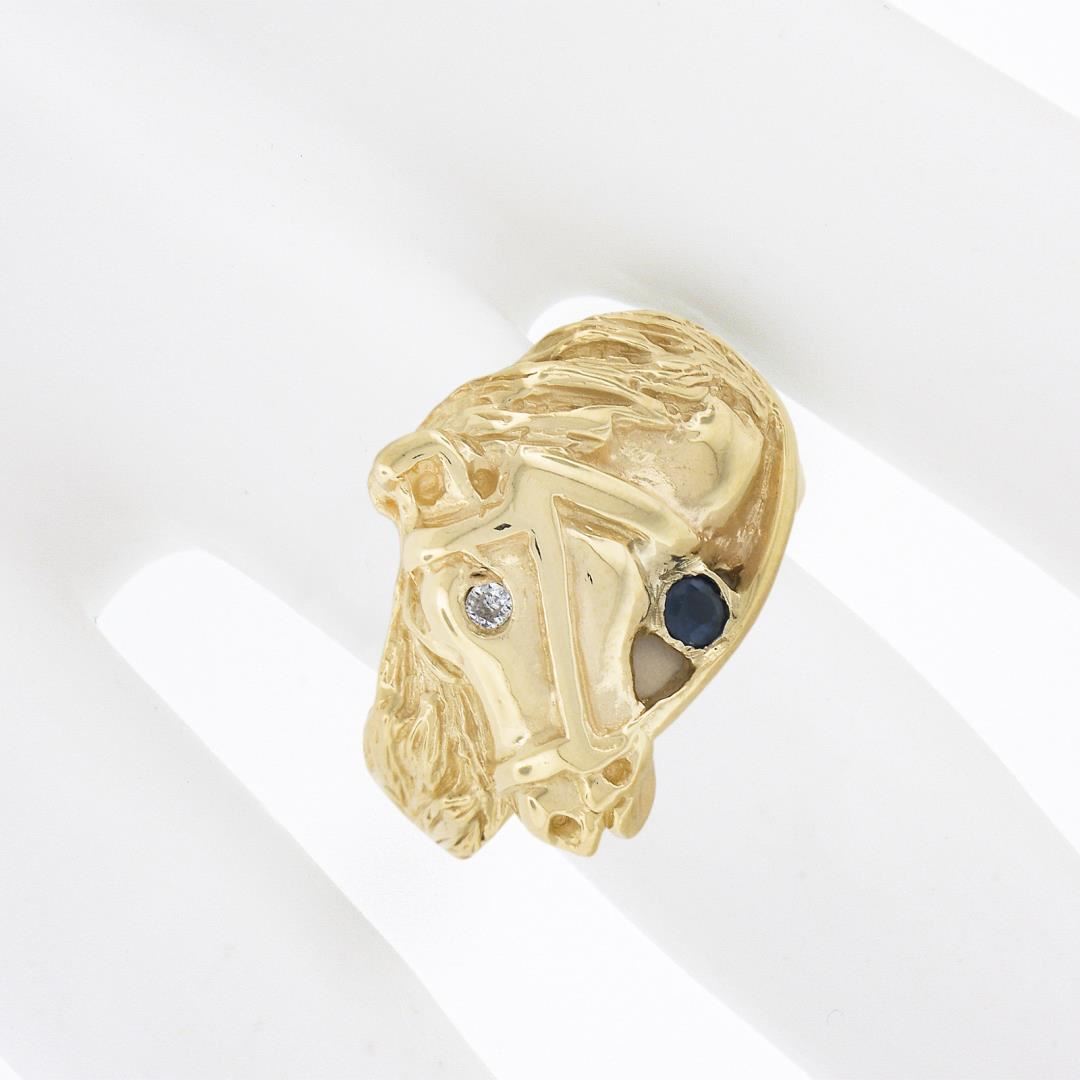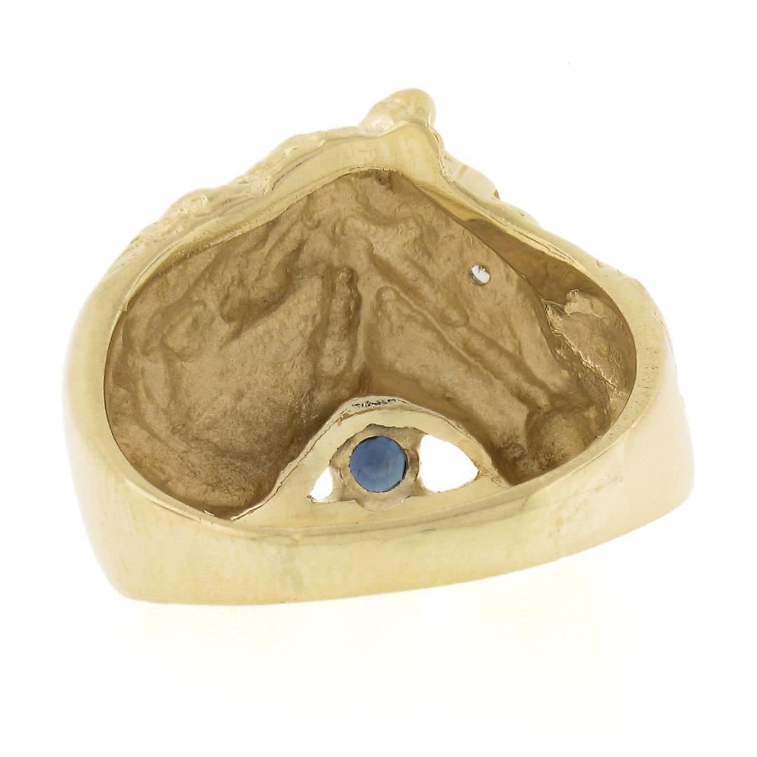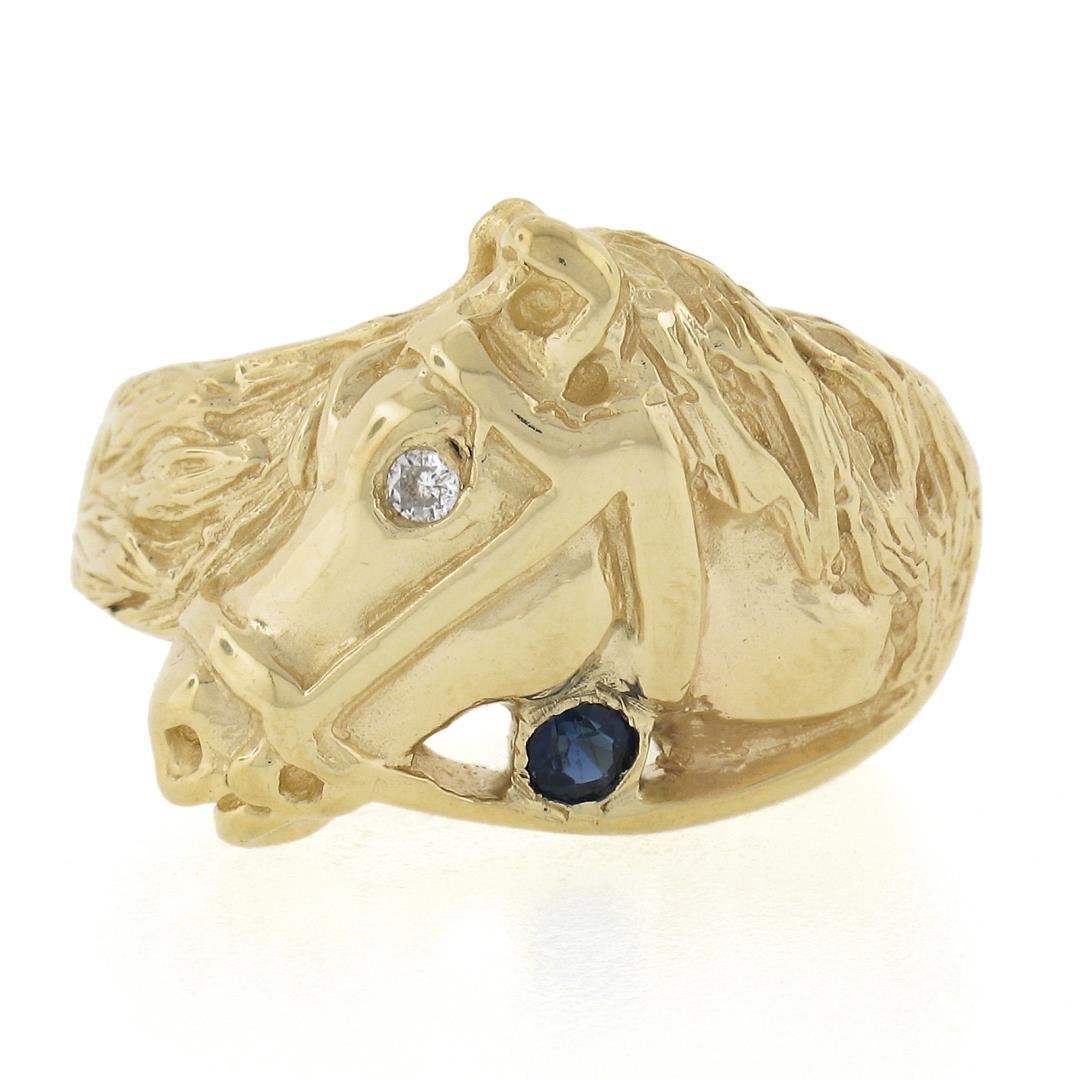 A solid 14k yellow gold horse ring, with 1 round cut natural diamond (G - SI2 ; 0.03ct), and 1 round cut natural sapphire (0.07ct). The ring is size 7.0, weighs a total of 7.71 grams, and measures 15.6mm wide.