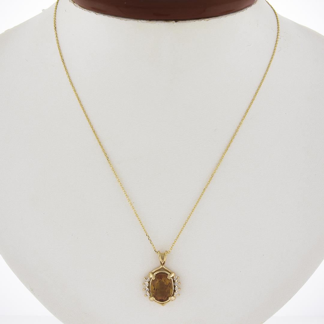 A solid 14k yellow gold pendant necklace, featuring 1 oval cut natural citrine (10.1x8.1mm), and 8 natural diamonds (H/I - I1/I2 ; 0.10ctw). Adjustable 16 & 18 inch cable link chain, 3.66 grams total weight, pendant measures 20.7x14.1mm.