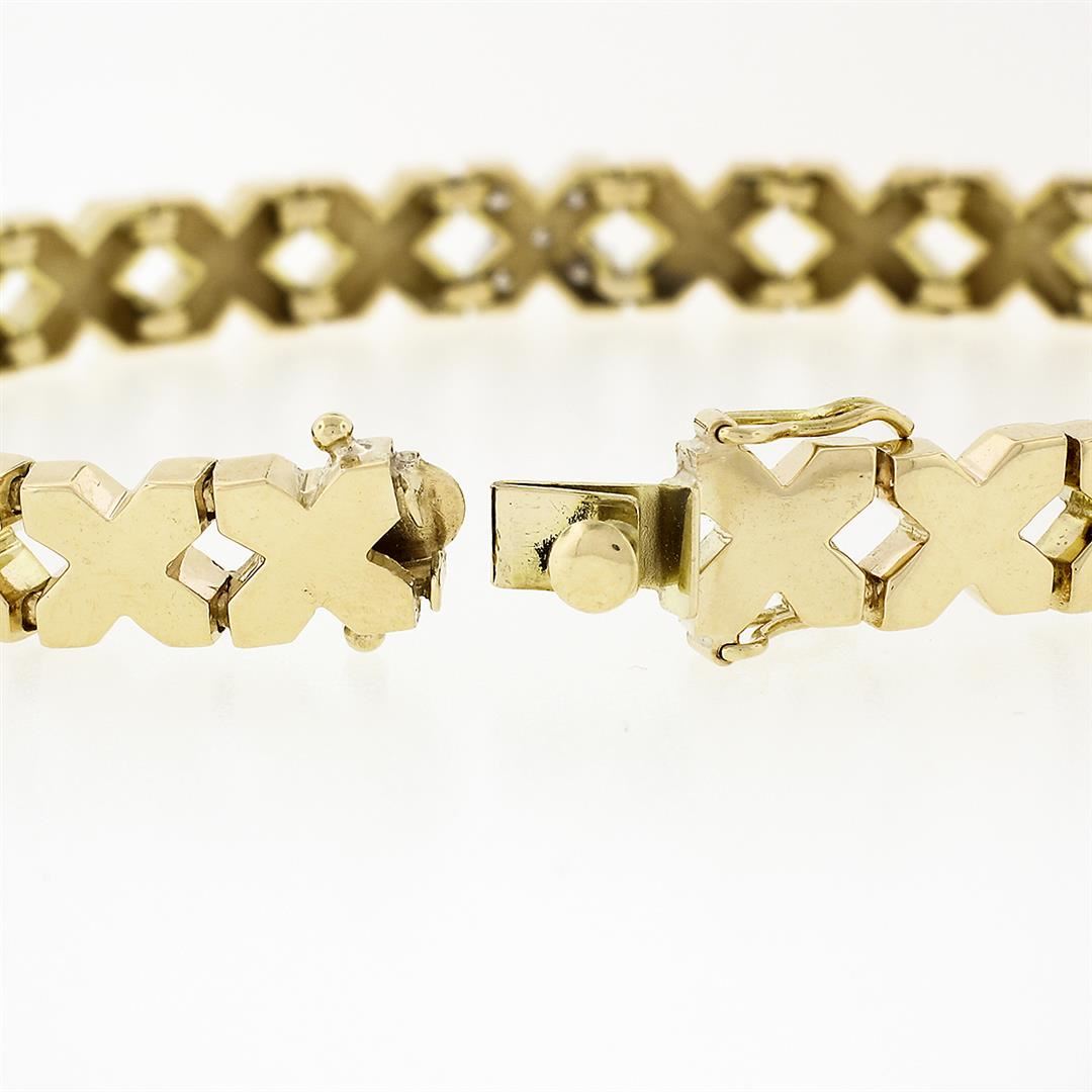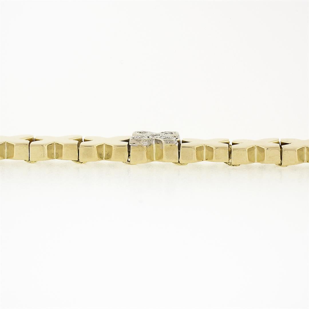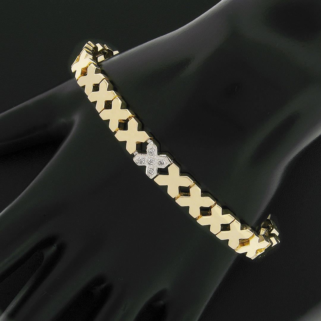 A solid 14k yellow & white gold x line link bracelet, with 5 round brilliant cut natural diamonds (G/H- VS2/SI1; 0.10ctw ). It weighs a total of 20.91 grams, measures 7.1mm wide, and measures 7 inches in length.