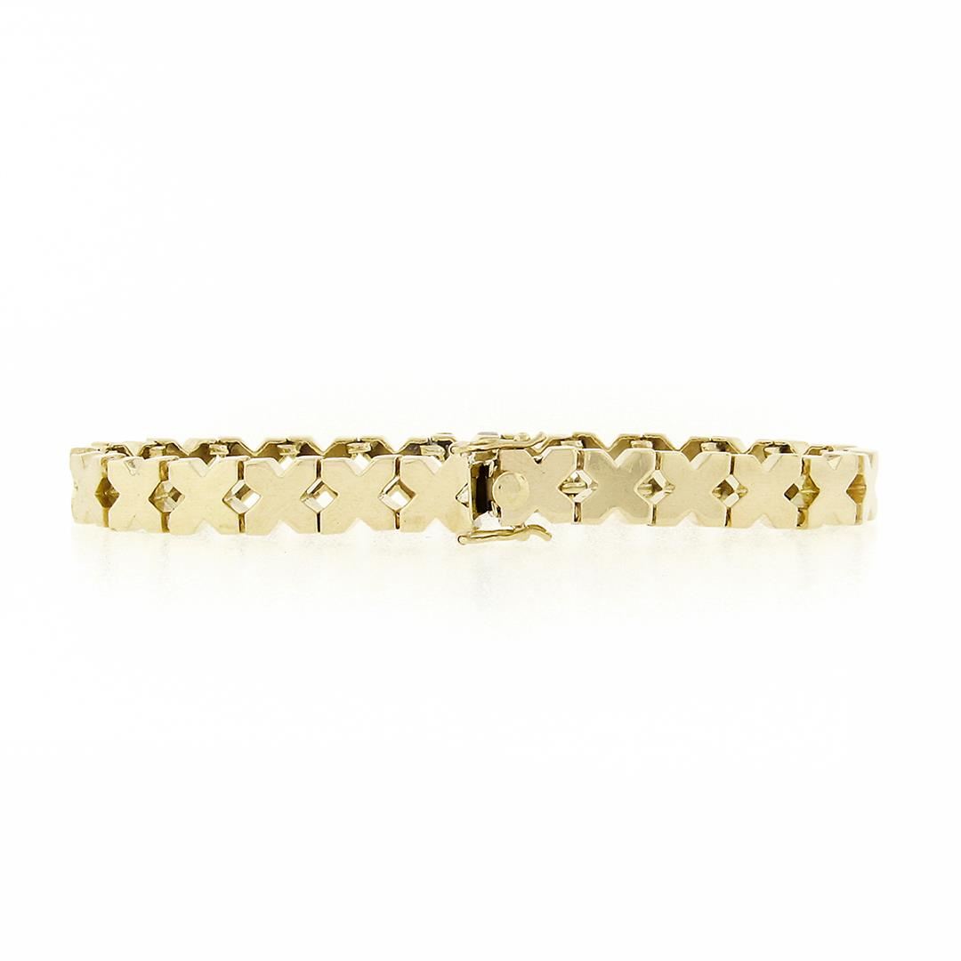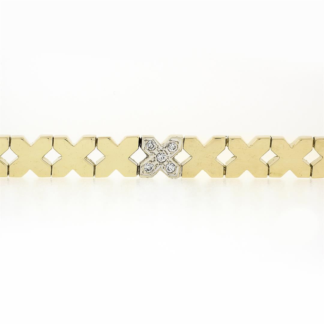 A solid 14k yellow & white gold x line link bracelet, with 5 round brilliant cut natural diamonds (G/H- VS2/SI1; 0.10ctw ). It weighs a total of 20.91 grams, measures 7.1mm wide, and measures 7 inches in length.