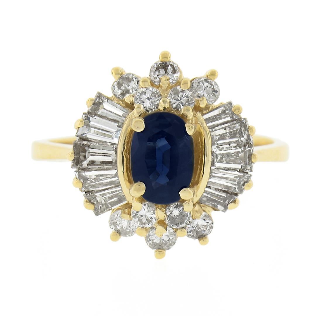 A solid 14k yellow gold ballerina ring, featuring 1 oval cut natural sapphire (0.75ct ), 10 round cut & 10 baguette cut natural diamonds (H-L - VS2-I1; 1.09ctw). The ring is size 6.0, weighs a total of 3.48 grams, and measures 14.4mm wide.