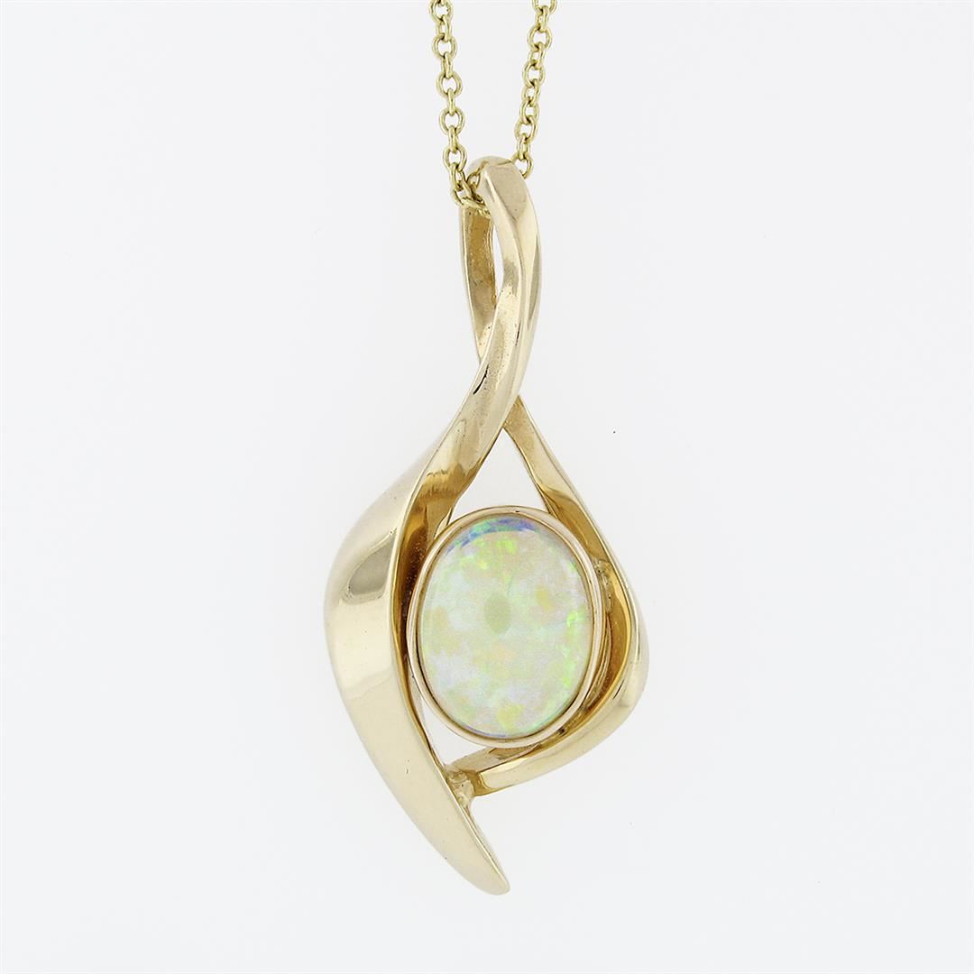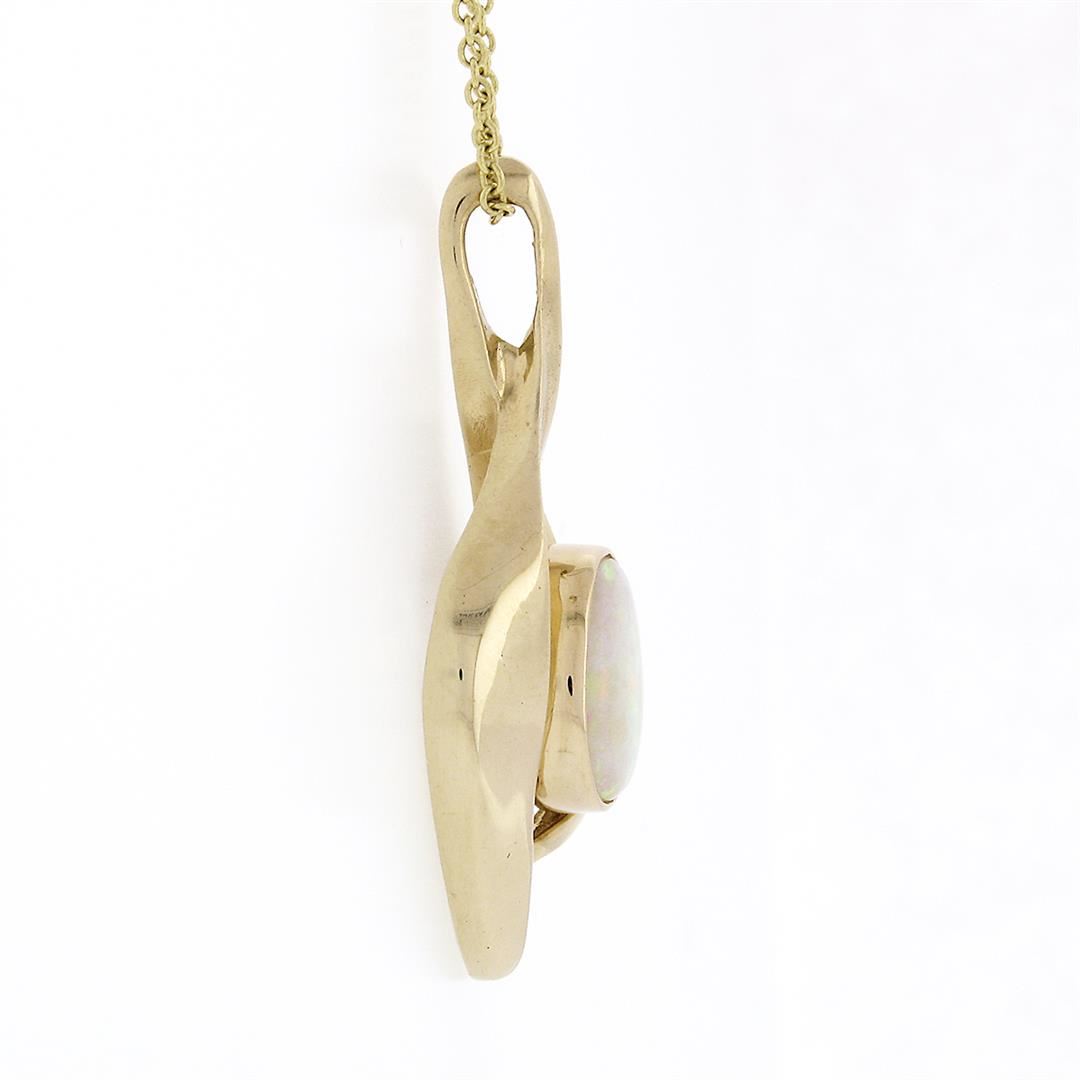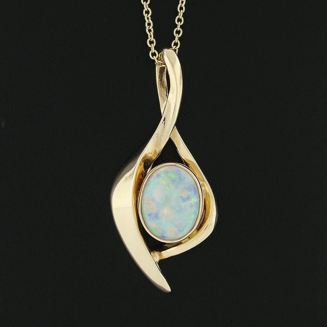 A solid 14k yellow gold pendant necklace, featuring 1 oval cabochon cut natural australian opal (8.2x10.2mm). 18 inch cable link chain, 6.41 grams total weight, pendant measures 33.80x15mm.