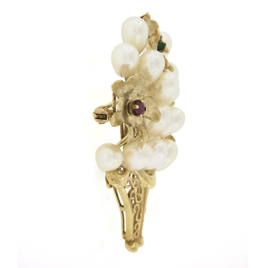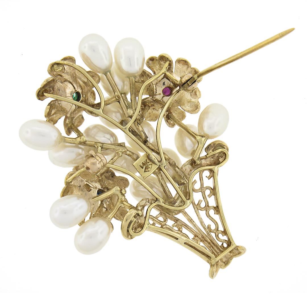 A solid 14k yellow gold flowers bouquet brooch, featuring 1 round cut natural ruby (0.08ct), 1 round cut natural emerald (0.06ct), 1 round cut natural sapphire (0.08ct), and 15 oval shape cultured pearls (6.6x4.9mm to 7x4.8mm). Measures 43.2x34.7mm and weighs a total of 10.92 grams.