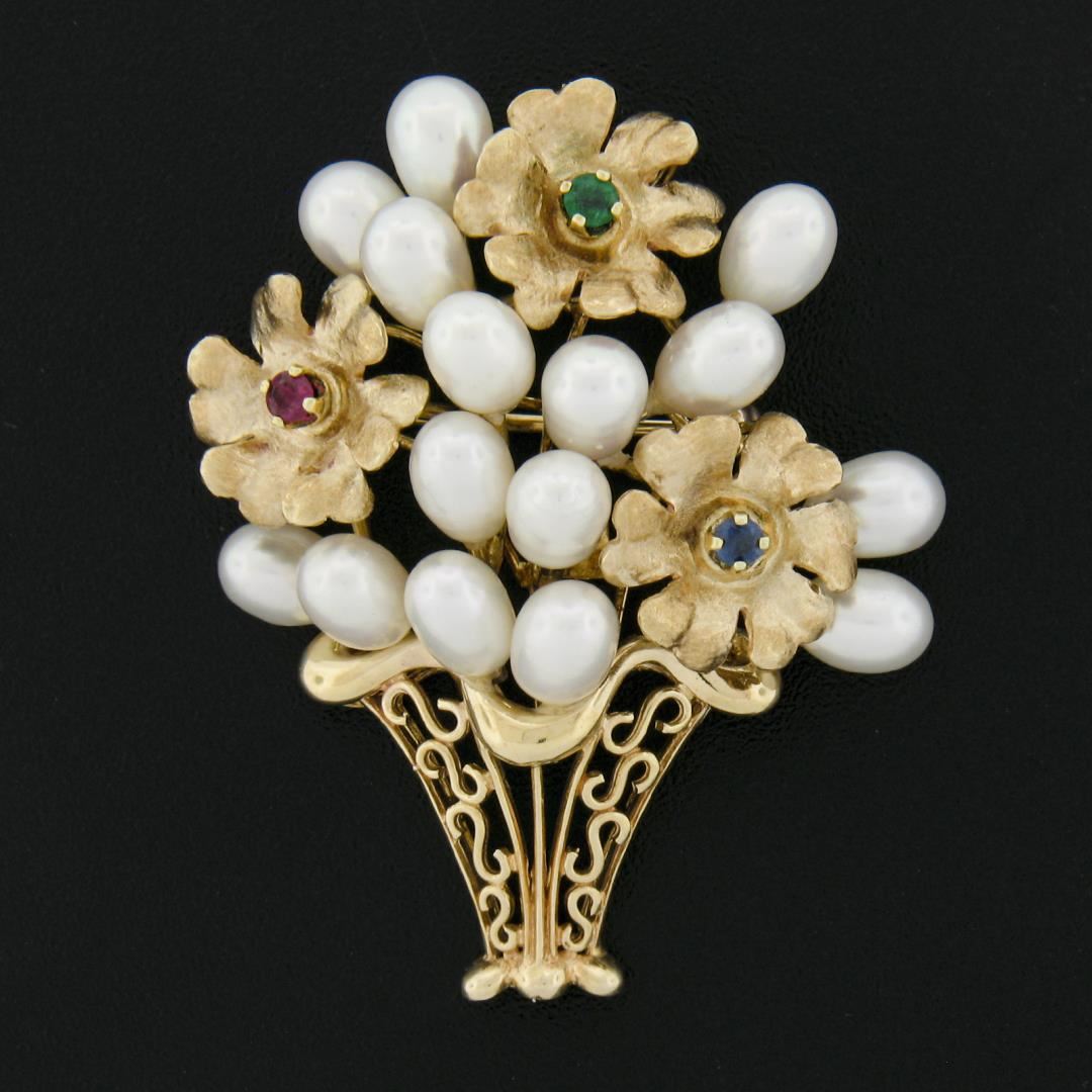 A solid 14k yellow gold flowers bouquet brooch, featuring 1 round cut natural ruby (0.08ct), 1 round cut natural emerald (0.06ct), 1 round cut natural sapphire (0.08ct), and 15 oval shape cultured pearls (6.6x4.9mm to 7x4.8mm). Measures 43.2x34.7mm and weighs a total of 10.92 grams.