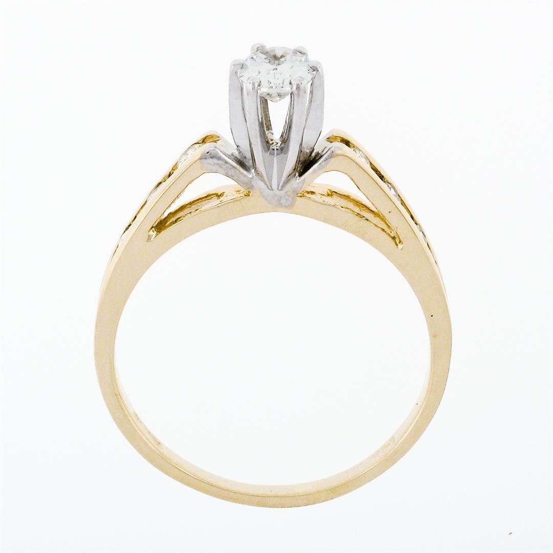 An estate solid 14k yellow & white gold engagement ring, with 1 oval cut natural diamond (H - VS2 ; 5.15x4.0mm - 0.38ct), and 6 round brilliant cut natural diamonds (G/H - VS1/VS2 ; 0.12ctw). The ring is size 5.5, weighs a total of 2.35 grams, and measures 5.45mm wide.