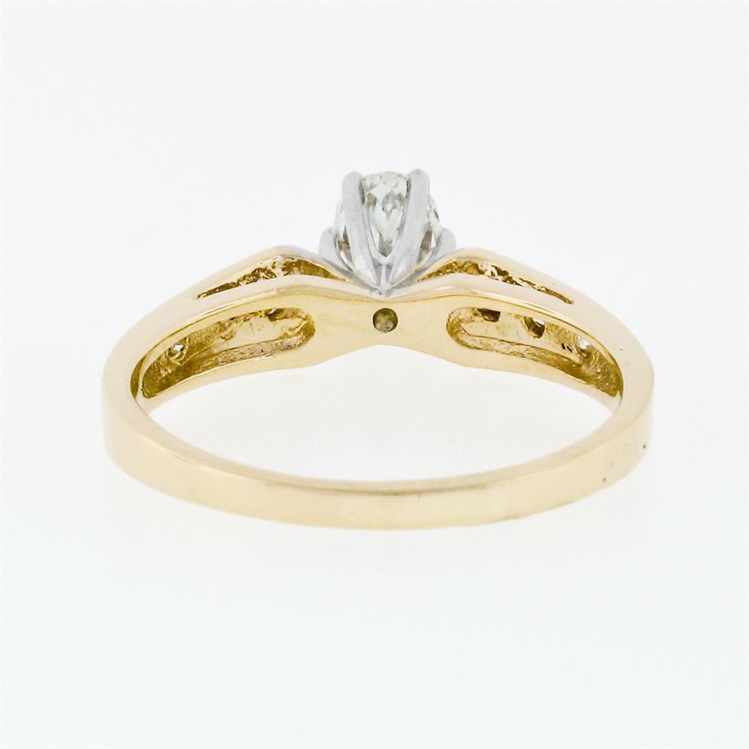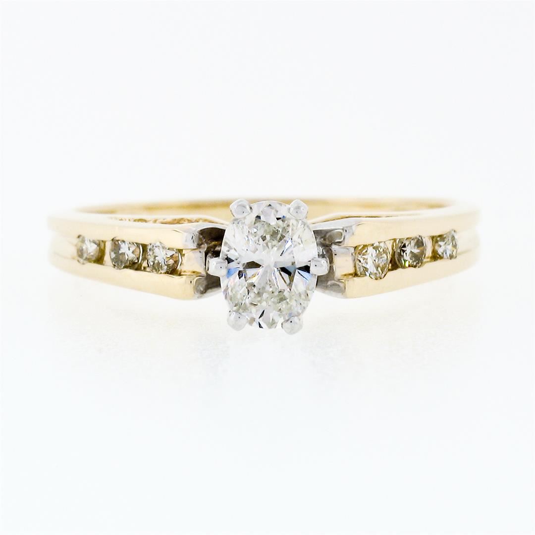 An estate solid 14k yellow & white gold engagement ring, with 1 oval cut natural diamond (H - VS2 ; 5.15x4.0mm - 0.38ct), and 6 round brilliant cut natural diamonds (G/H - VS1/VS2 ; 0.12ctw). The ring is size 5.5, weighs a total of 2.35 grams, and measures 5.45mm wide.