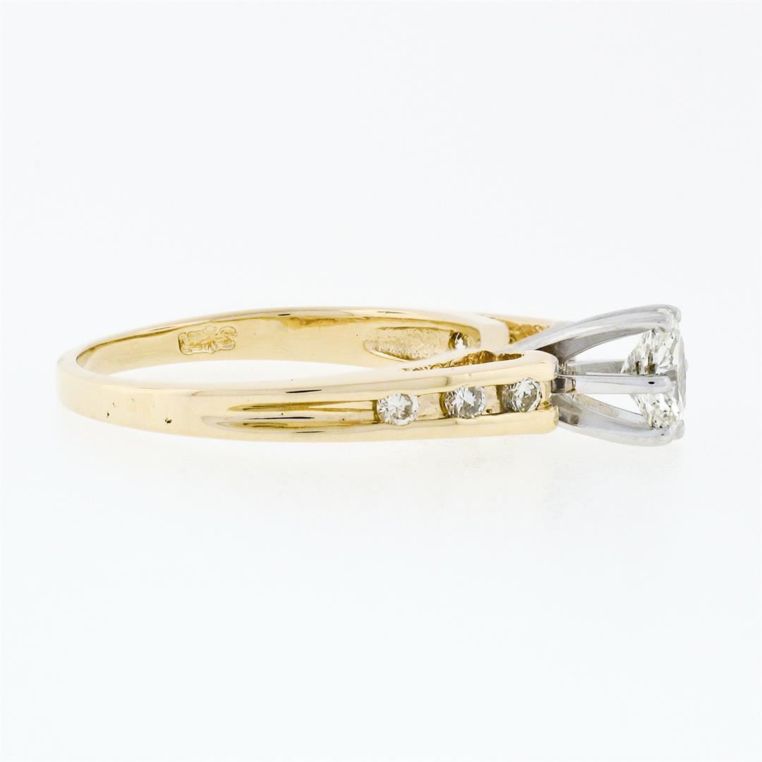 An estate solid 14k yellow & white gold engagement ring, with 1 oval cut natural diamond (H - VS2 ; 5.15x4.0mm - 0.38ct), and 6 round brilliant cut natural diamonds (G/H - VS1/VS2 ; 0.12ctw). The ring is size 5.5, weighs a total of 2.35 grams, and measures 5.45mm wide.