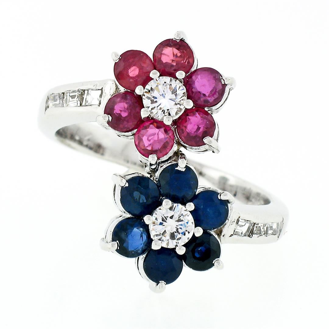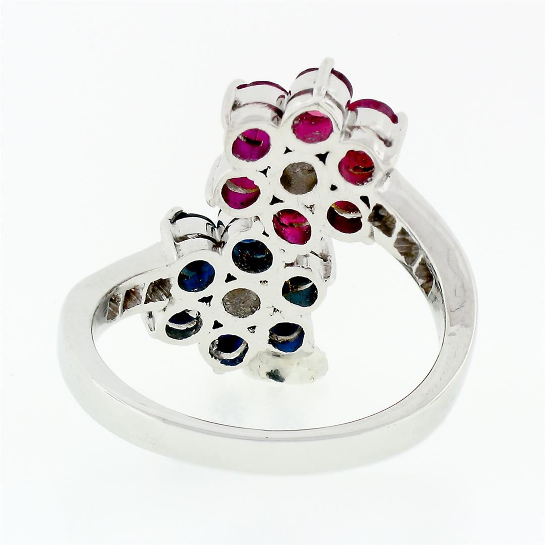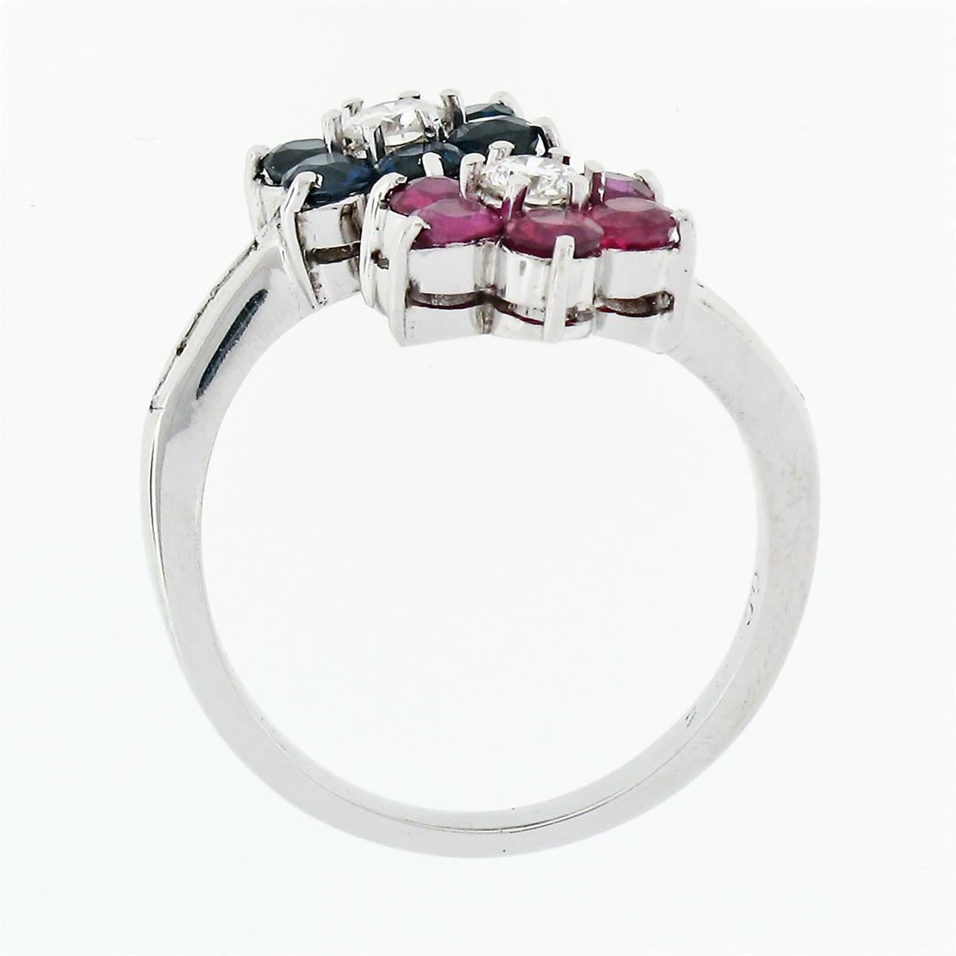 A solid 14 k white gold floral bypass ring, with 6 round brilliant cut natural rubies (0.66ctw), 6 round brilliant cut natural sapphire (0.66ctw), 2 round brilliant cut natural diamonds (G - VS1; 0.20ctw), and 6 rectangular step cut natural diamonds (F/G - VS1/VS2; 0.18ctw). The ring is size 5.0, weighs a total of 4.34 grams, and measures 17.7mm wide.