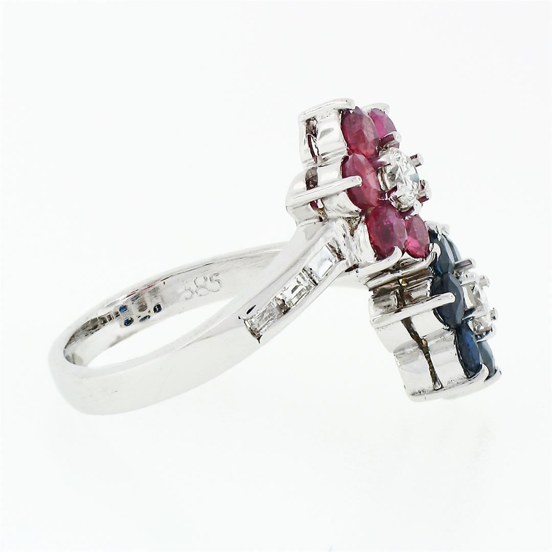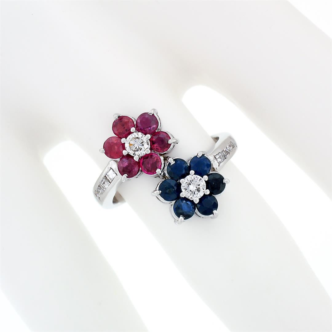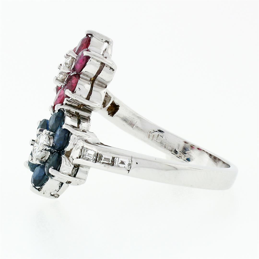 A solid 14 k white gold floral bypass ring, with 6 round brilliant cut natural rubies (0.66ctw), 6 round brilliant cut natural sapphire (0.66ctw), 2 round brilliant cut natural diamonds (G - VS1; 0.20ctw), and 6 rectangular step cut natural diamonds (F/G - VS1/VS2; 0.18ctw). The ring is size 5.0, weighs a total of 4.34 grams, and measures 17.7mm wide.