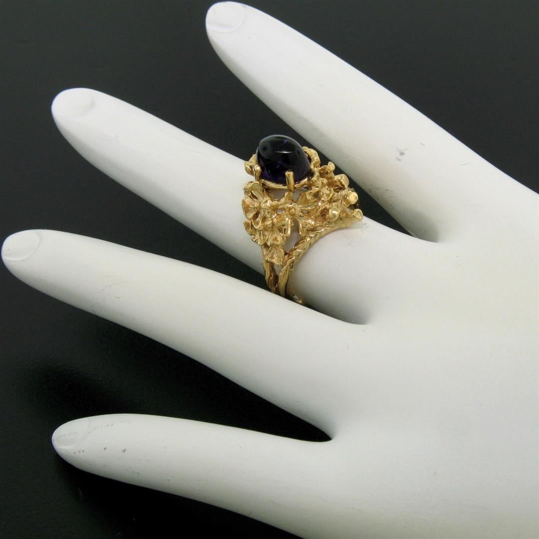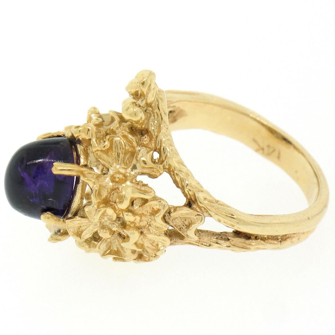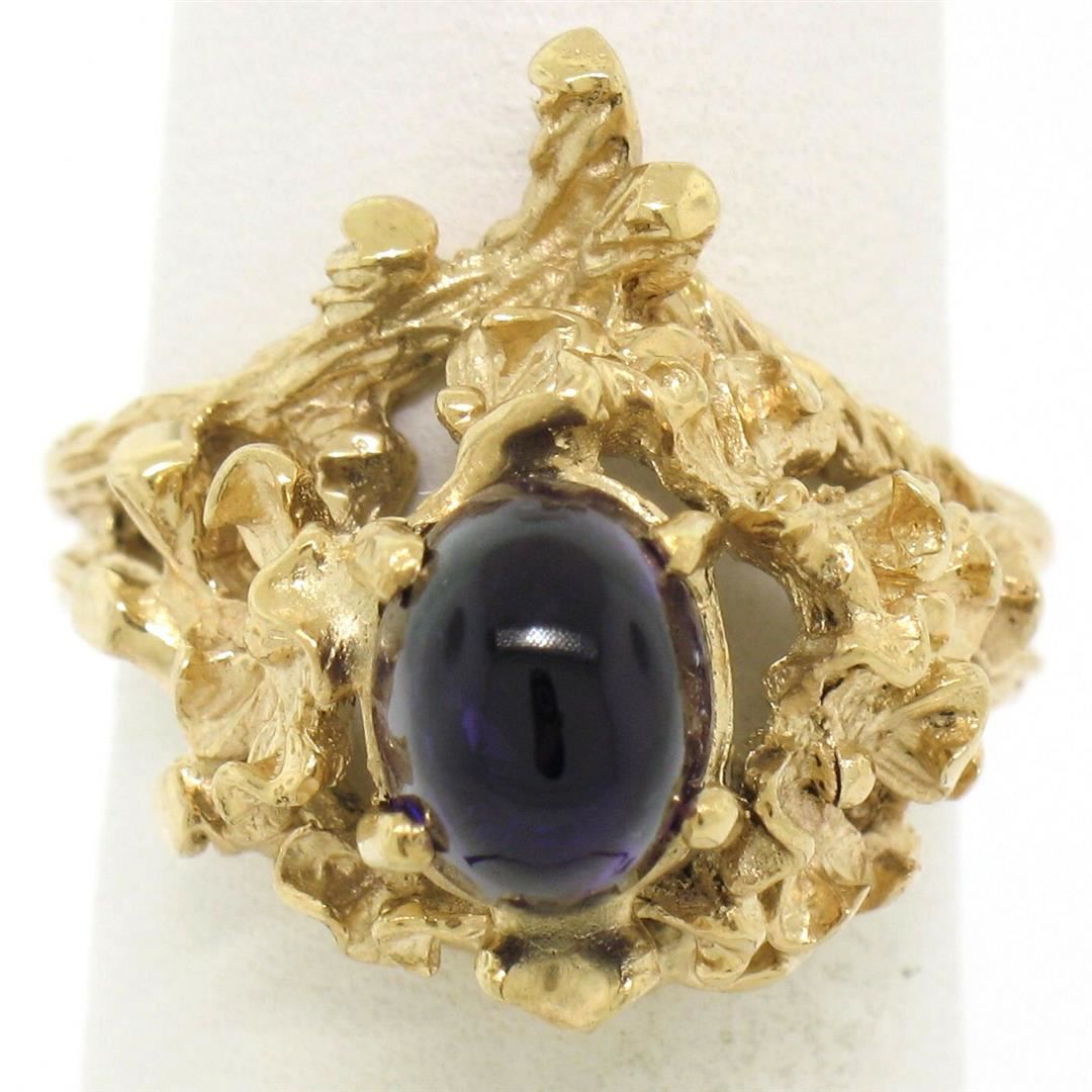 A like new 14k yellow gold ring set with a 1.98ct oval cabochon amethyst. The ring is size 5.5, weighs a total of 7.38 grams, and measures 18.48mm wide.