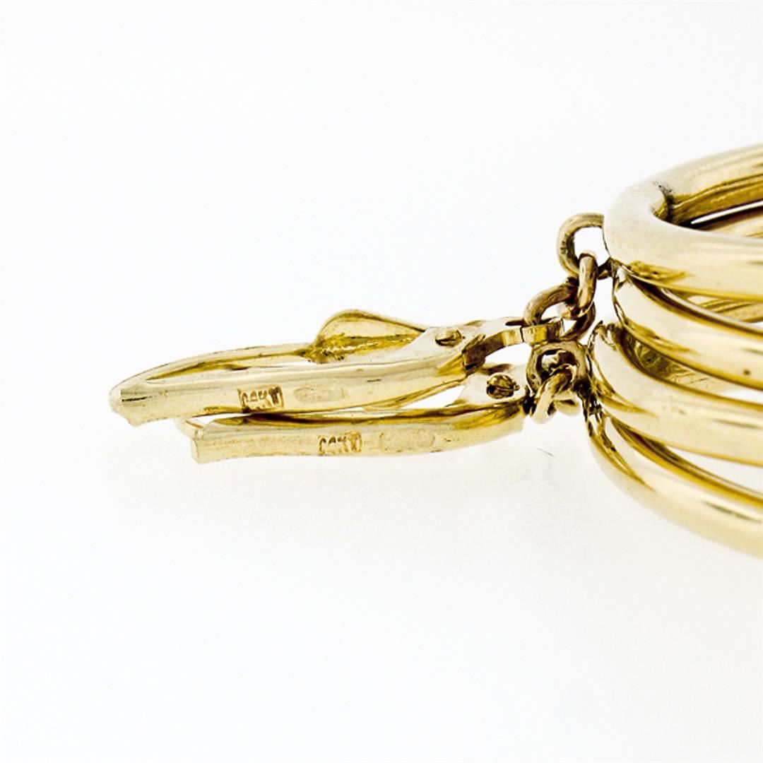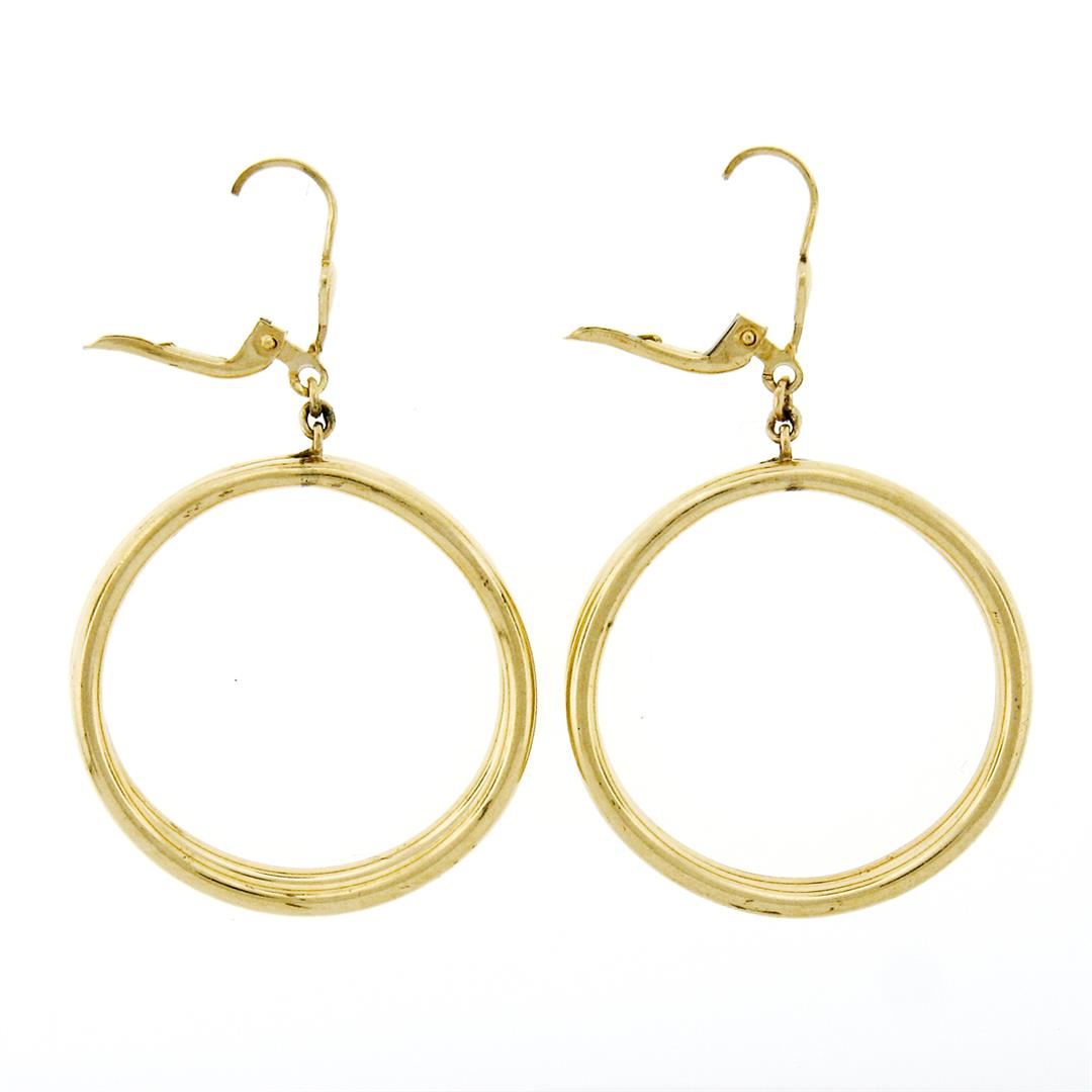 An estate solid 14k yellow gold hoop dangle earrings. The earrings measure overall height approximately 54.3mm and weigh a total of 10.92 grams.