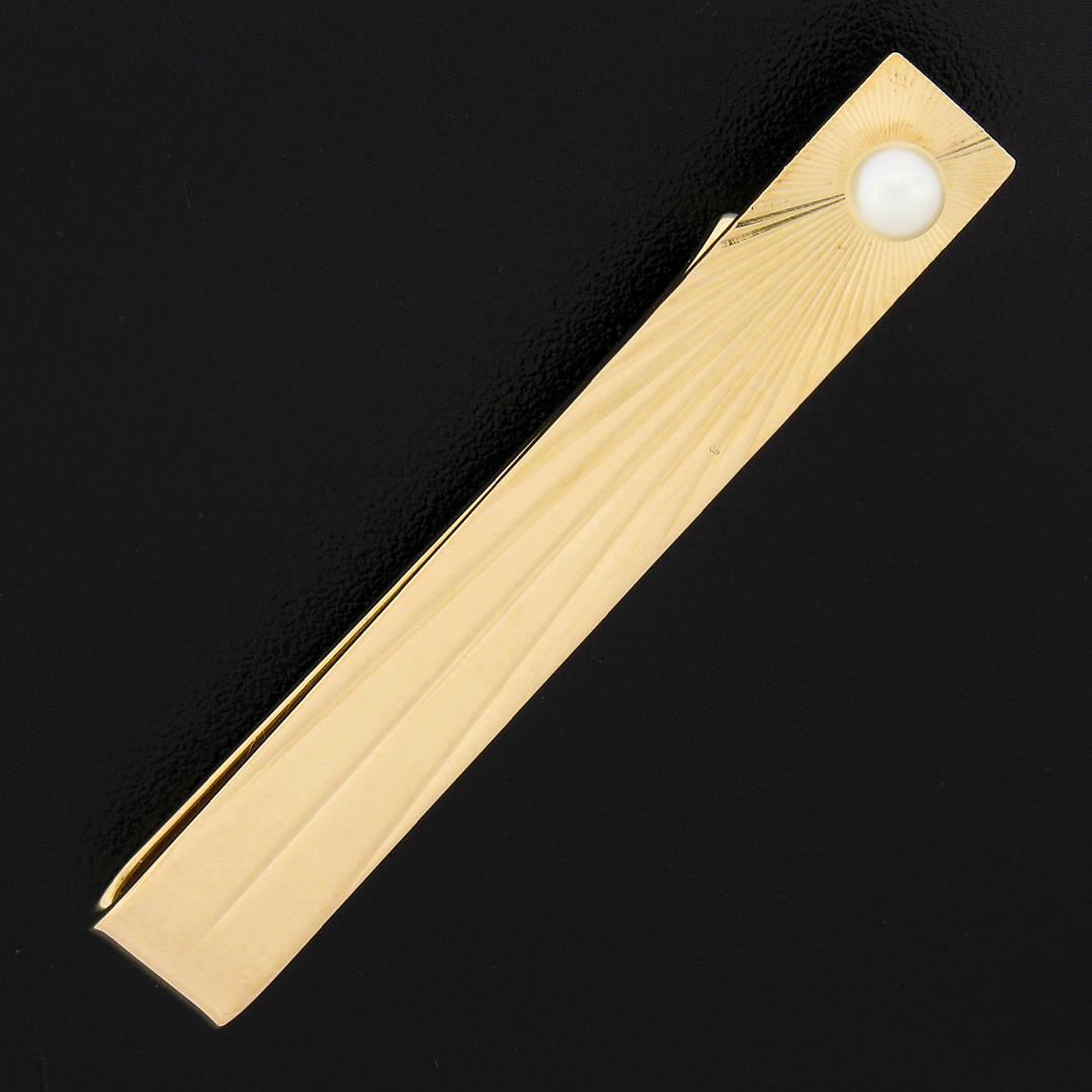 A solid 14k yellow gold tie bar clip, with 1 round shape cultured pearl (3.5mm ). Measures 44.57x6.4mm and weighs a total of 5.95 grams.
