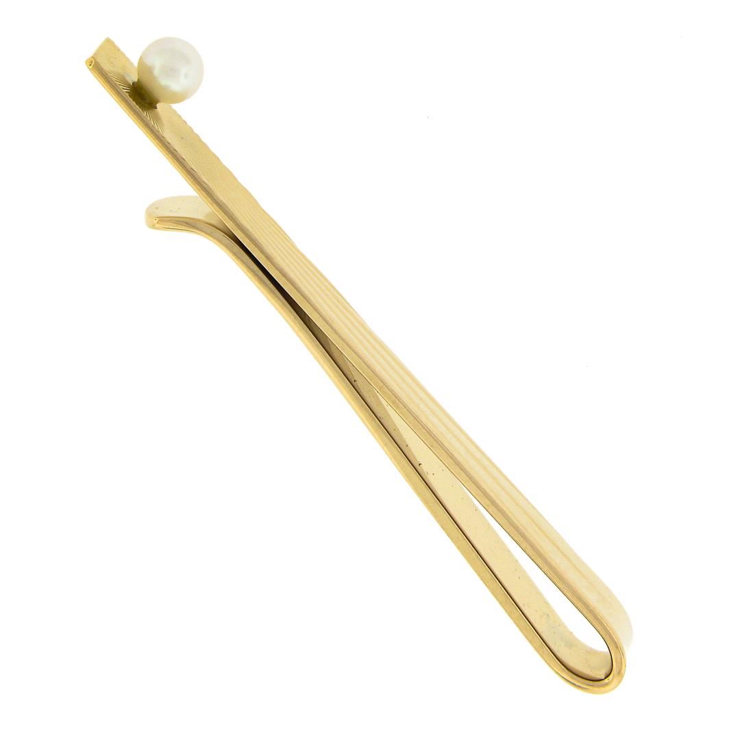 A solid 14k yellow gold tie bar clip, with 1 round shape cultured pearl (3.5mm ). Measures 44.57x6.4mm and weighs a total of 5.95 grams.