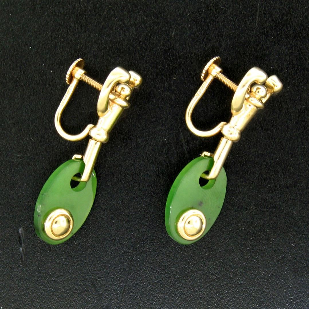 Excellent condition 14k yellow gold screw-on earrings with a pair of approximately 17.3x11.2mm oval disk cut jades. The earrings measure approximately 37.0x12.5mm and weigh a total of 9.50 grams.