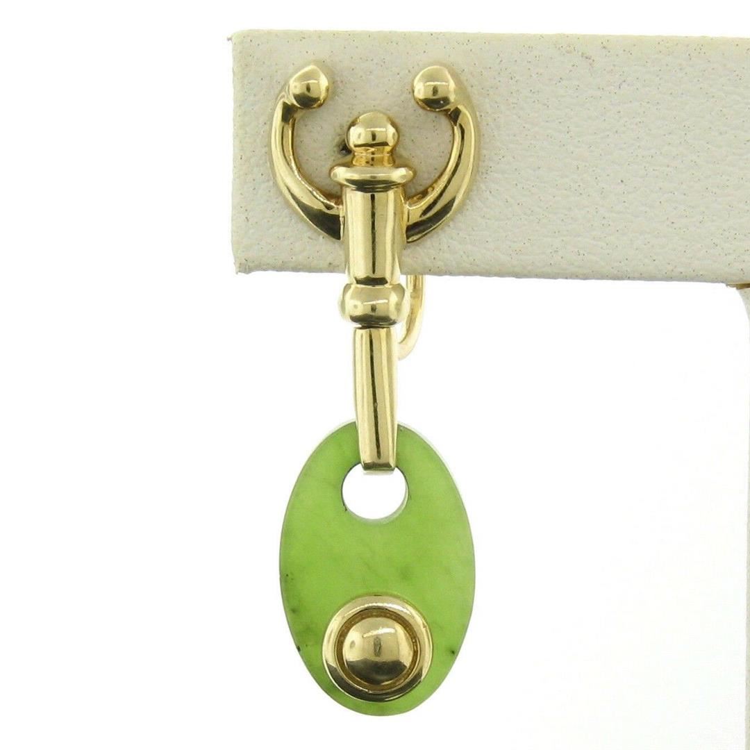 Excellent condition 14k yellow gold screw-on earrings with a pair of approximately 17.3x11.2mm oval disk cut jades. The earrings measure approximately 37.0x12.5mm and weigh a total of 9.50 grams.