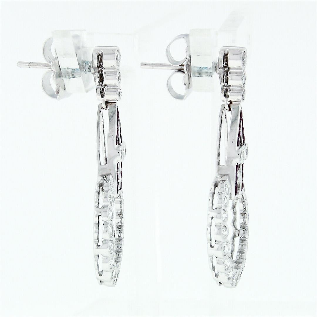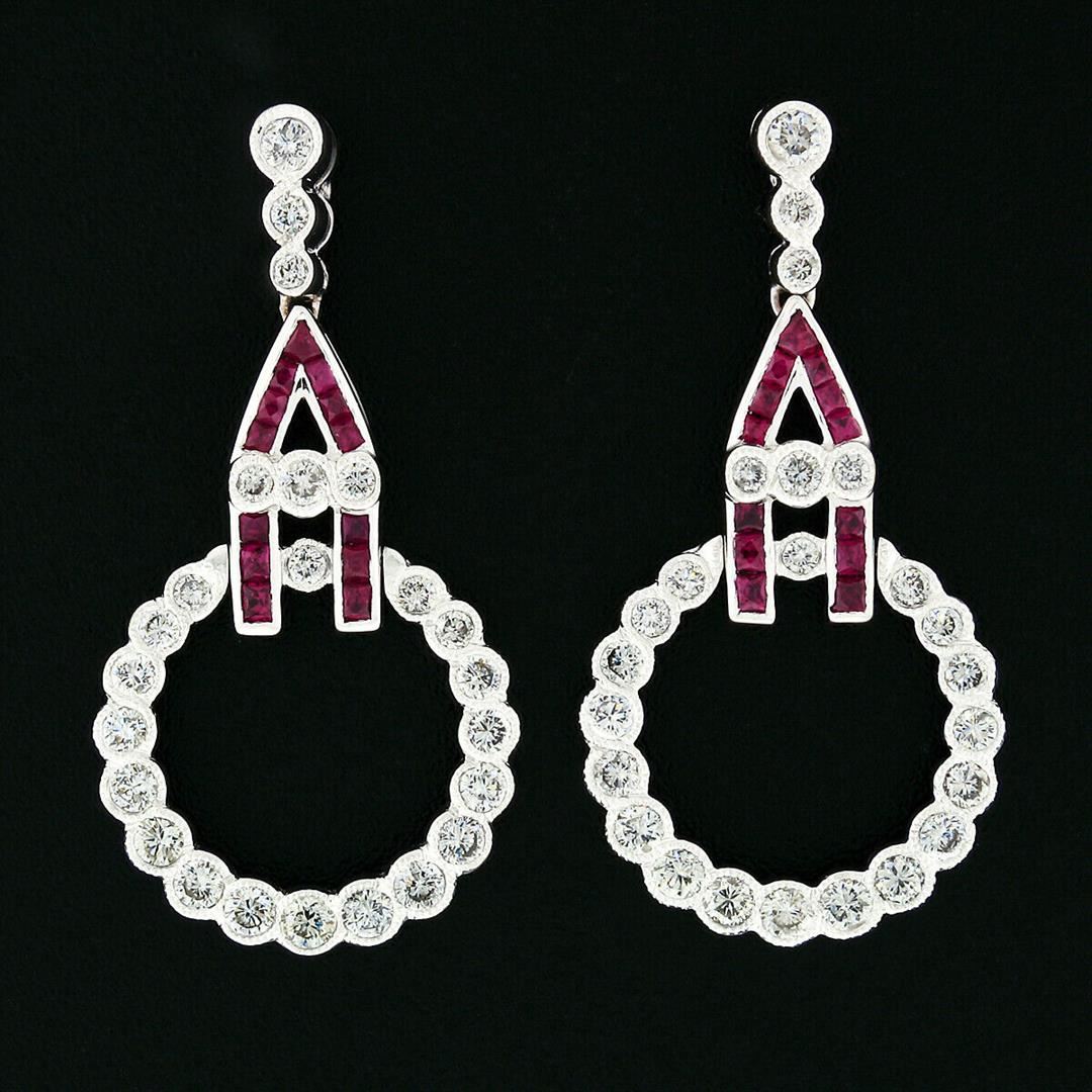 A pair of solid 18k white gold circle drop dangle earrings with 48 round brilliant cut natural diamonds (G/H - VS1/VS2; 1.50ctw), and 26 french cut natural rubies (1.0ctw). The earrings measure approximately 35x17.75mm and weigh a total of 7.56 grams.