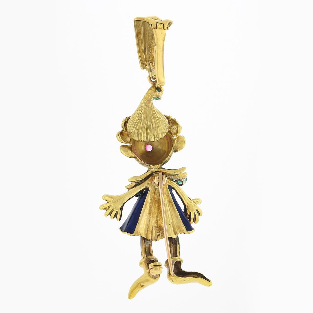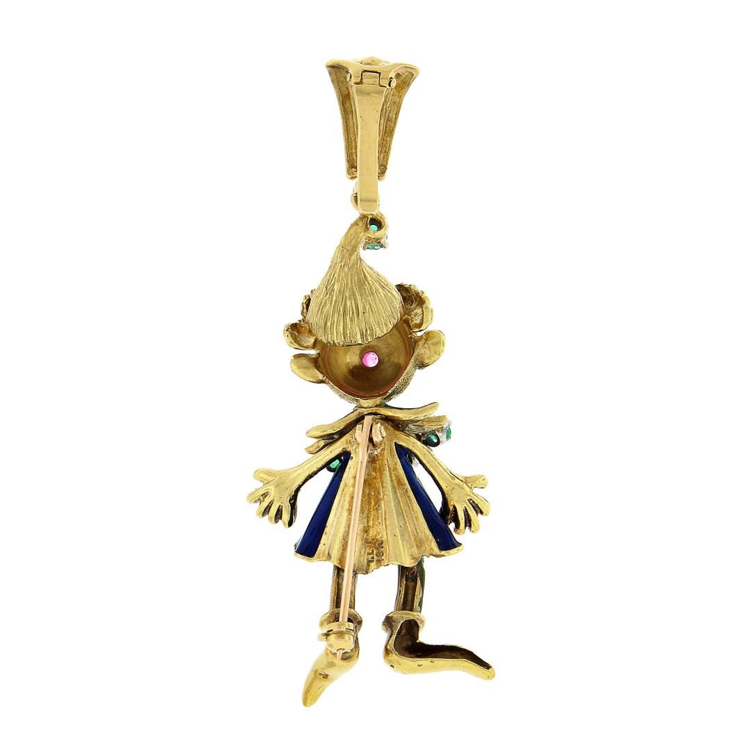 A solid 18k yellow gold and enamel workl brooch pendant, with 1 round brilliant cut natrual ruby (0.06ctw), 2 round brilliant cut natural diamonds (G/H - VS1/VS2 ; 0.14ctw), and 3 round brilliant cut natural emeralds ( 0.24ctw). Measures 64.3x24.9mm and weighs a total of 18.05 grams.